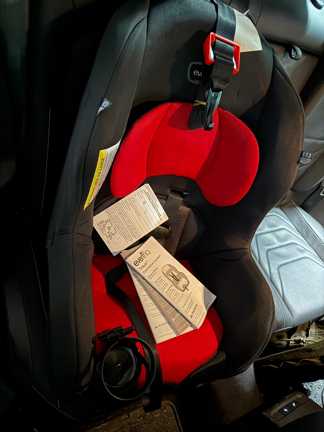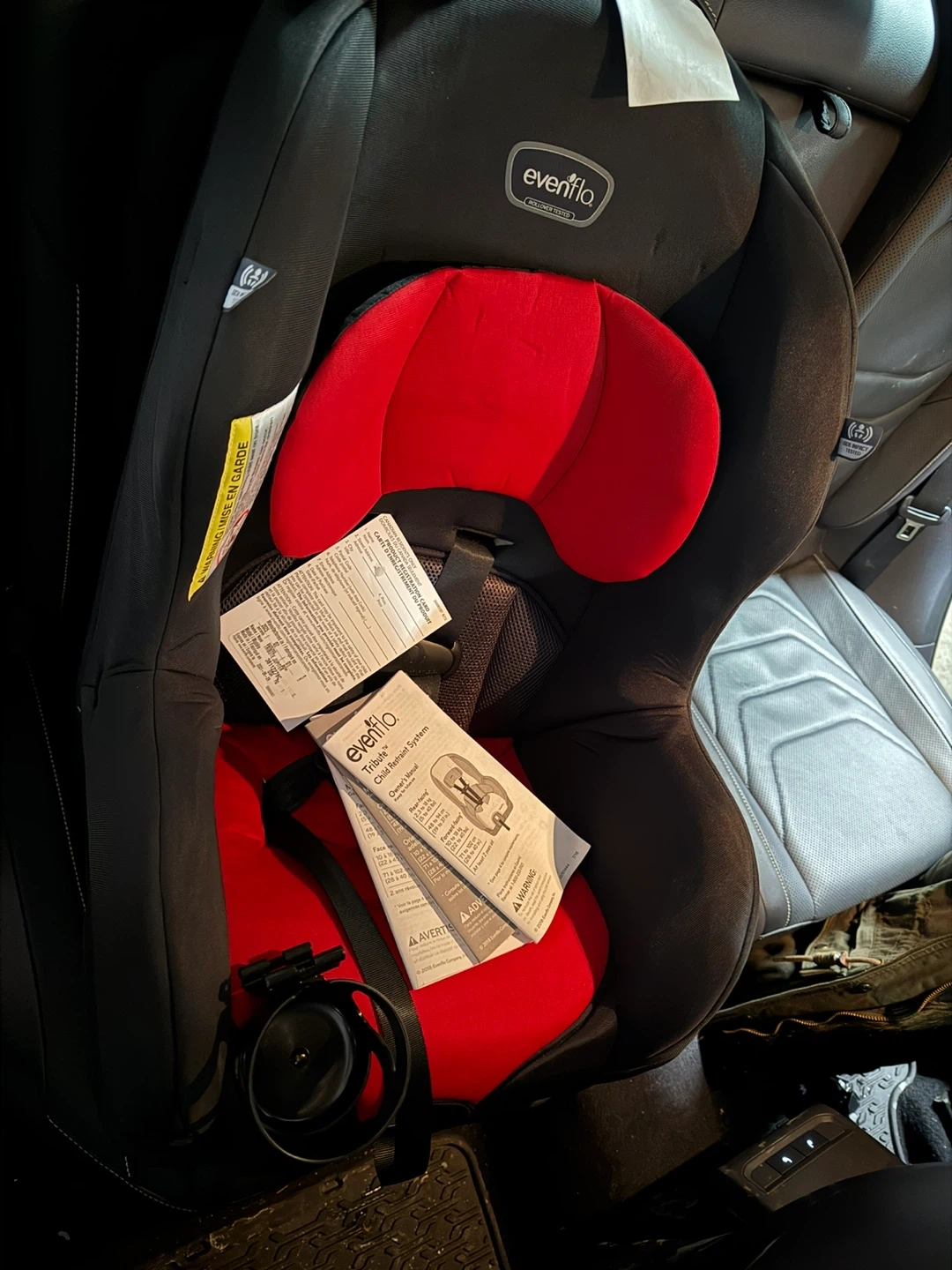 Selling an Evenflo car seat in a box pack condition . We got two car seats as a gift so that’s a reason to give at a lower price to help others . It's rollover tested for safety and has a black and red colour scheme. Perfect for keeping your little one safe and secure on the road