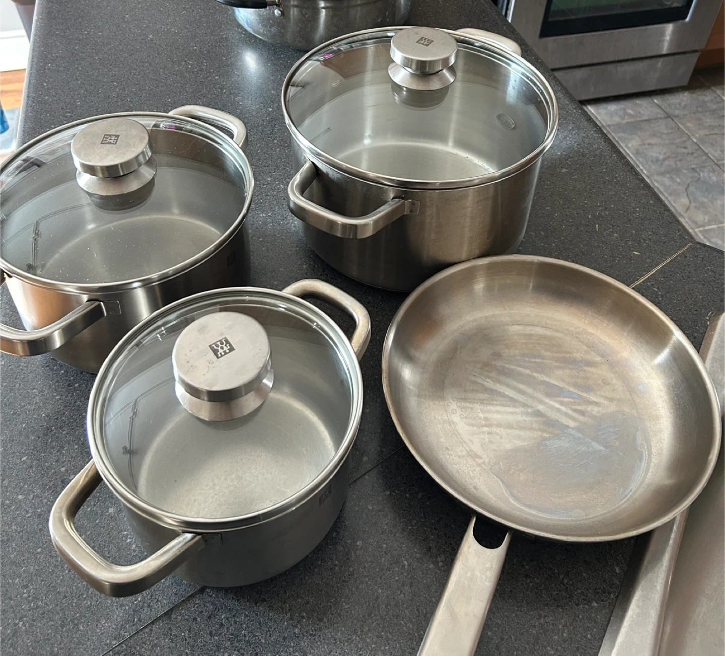 This is a set of Zwilling stainless steel pots and a frying pan. It includes a small pot with a lid, a medium pot with a lid, a large pot with a lid, and a frying pan. They're made from durable stainless steel with clear glass lids. This set is great for everyday cooking needs.