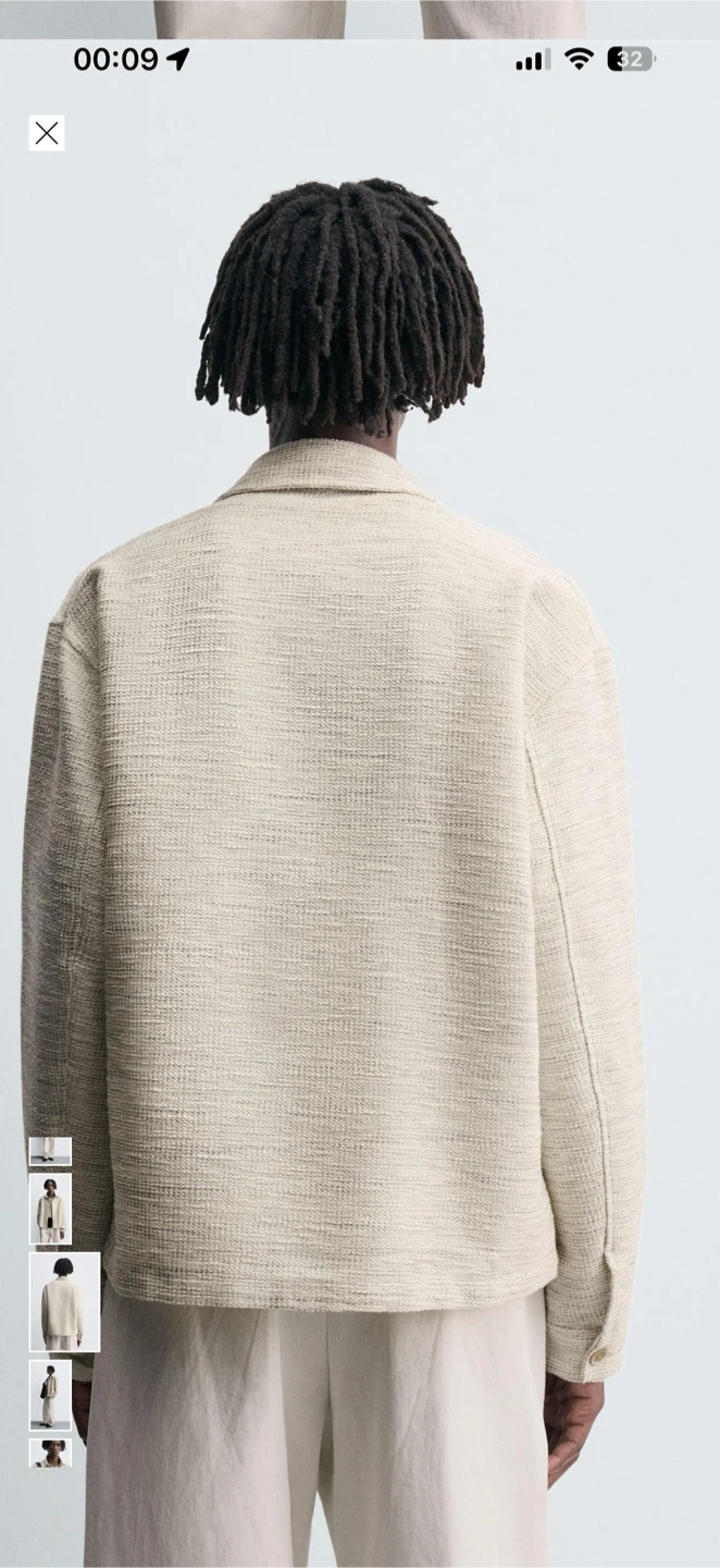 Zara textured overshirt in a neutral cream and grey weave. It's a size medium with button-up front and a classic collar. This shirt works for layering in cooler weather.