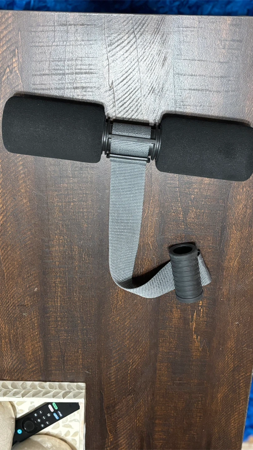 This sit up bar is designed for home fitness. It features foam padding for comfort and an adjustable strap for secure attachment. Simply slide it under a door to help with sit-ups and other exercises!