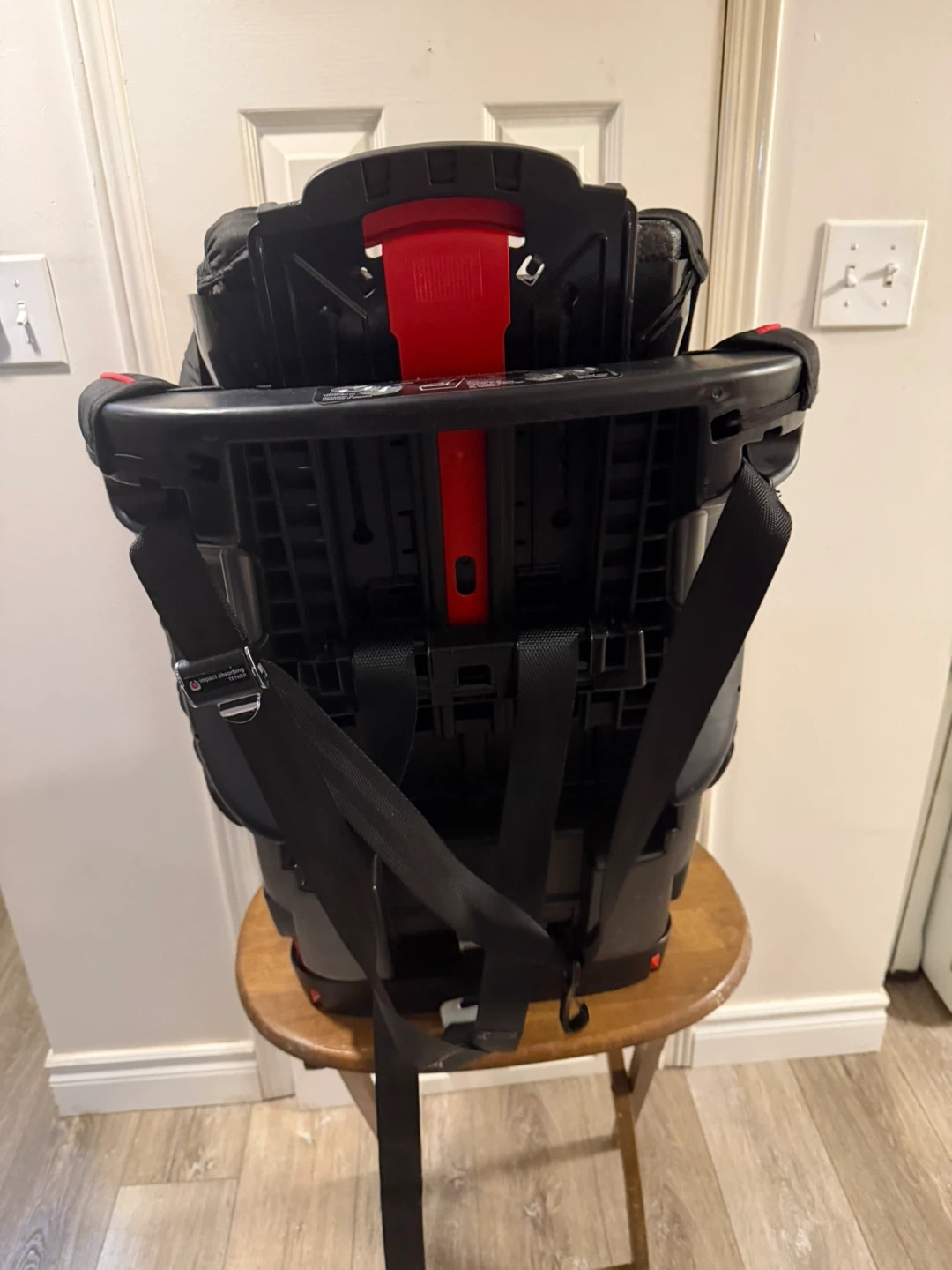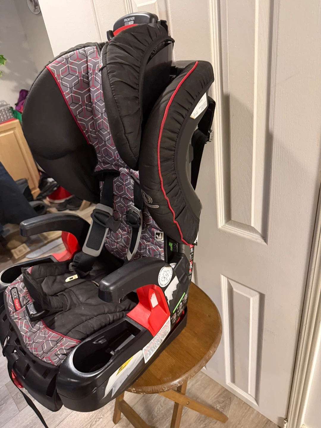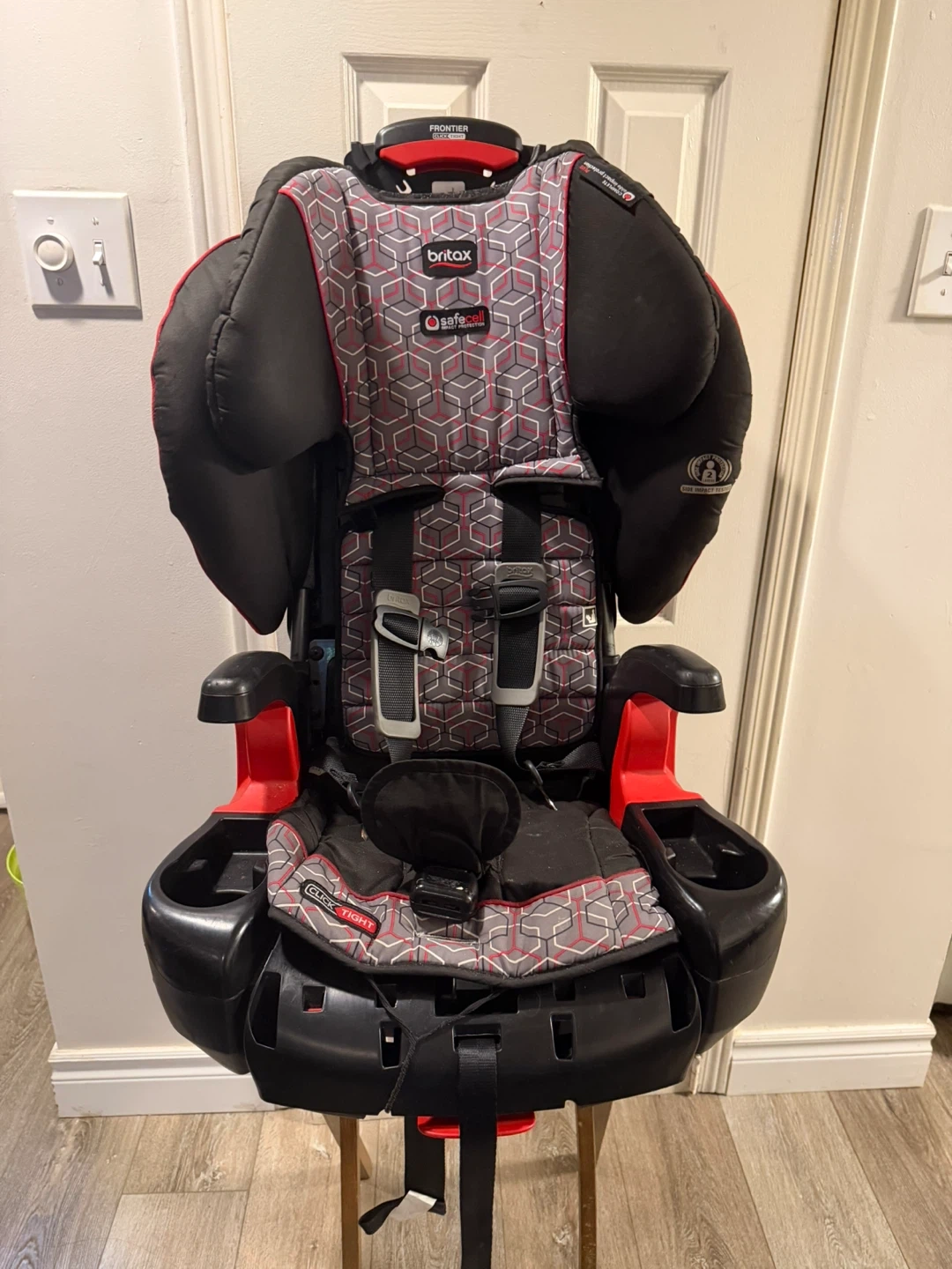 This is a Britax Frontier CT child car seat with a red, grey, and black pattern. It features dual cup holders and a 5-point harness. Made in 2017, it's a solid choice for keeping your little one safe on the road!