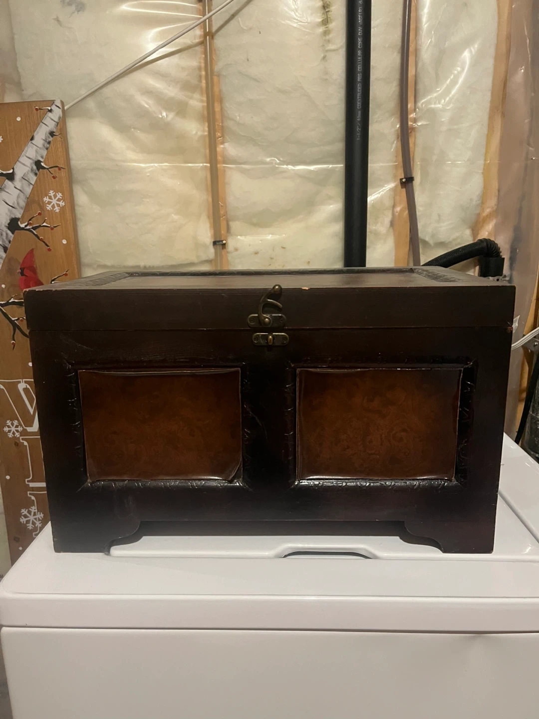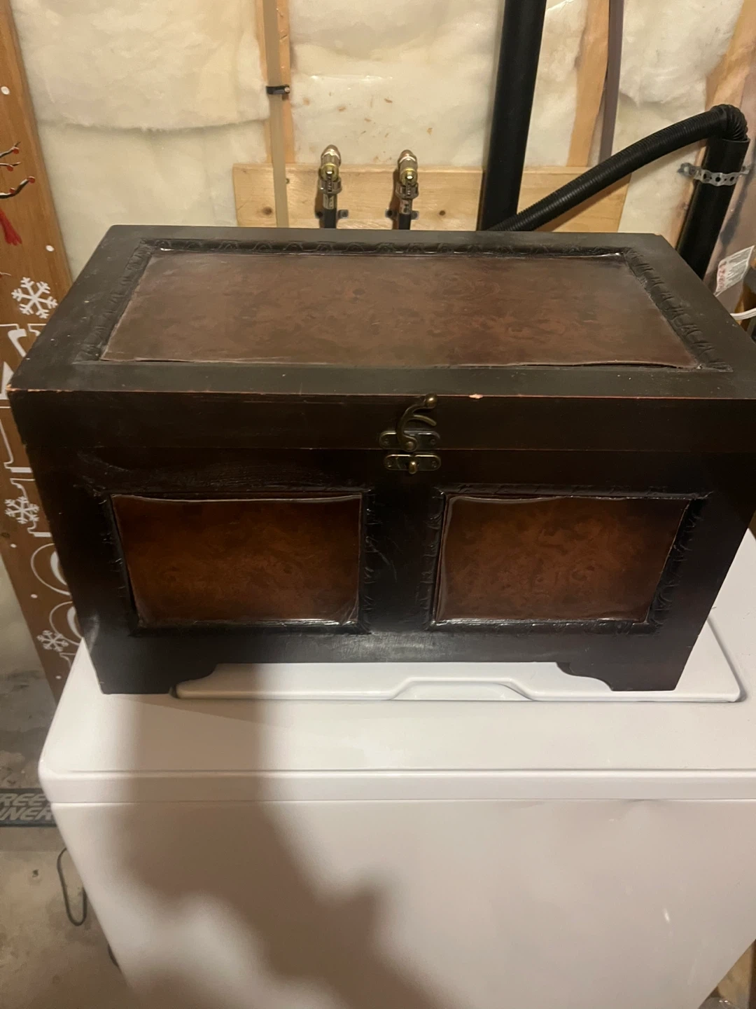 A decorative wooden chest with a dark finish and embossed panels. It's perfect for storing blankets, toys, or other household items. The hinged lid and latch keep contents secure. This chest would look great in a living room or bedroom!