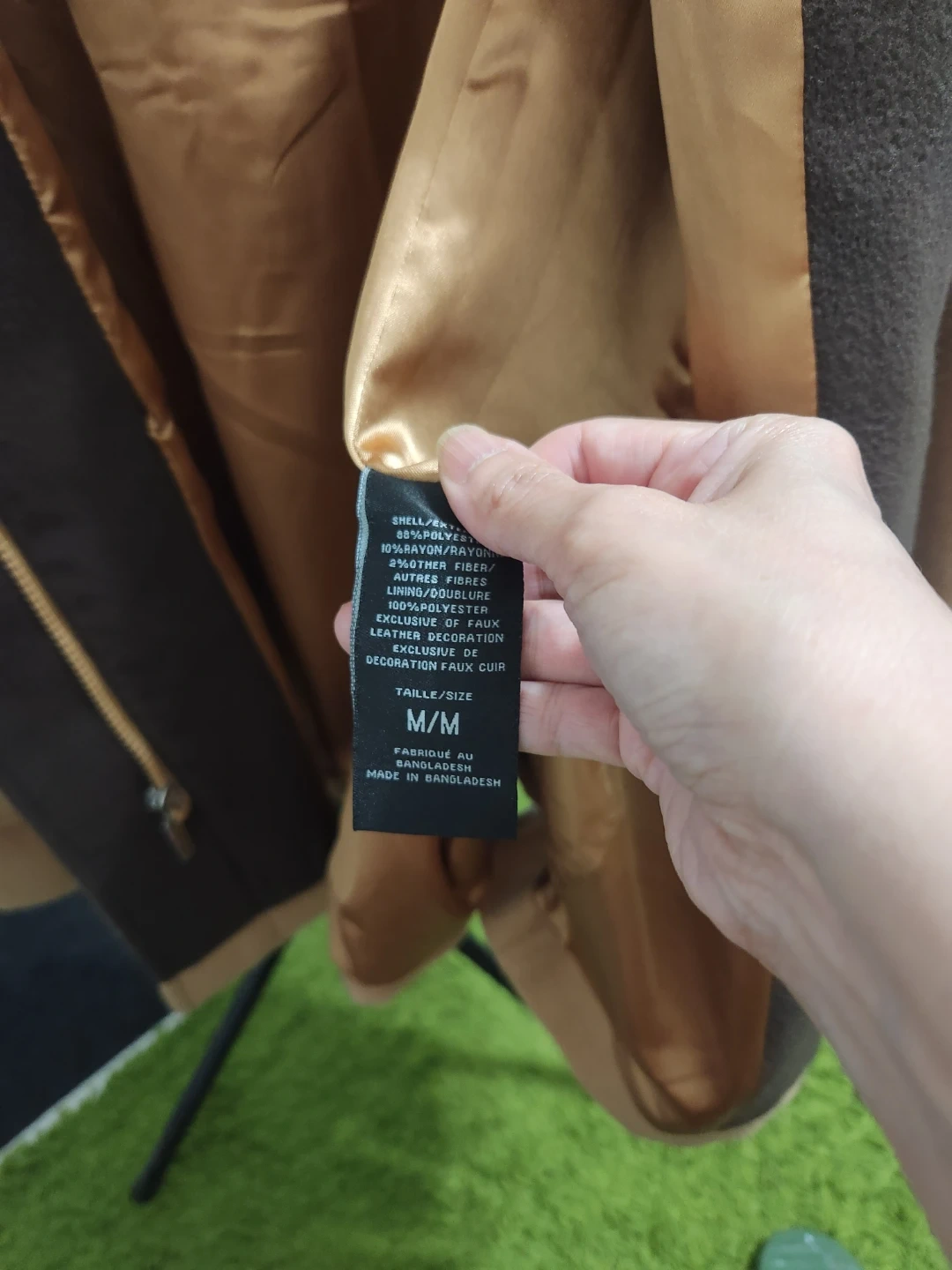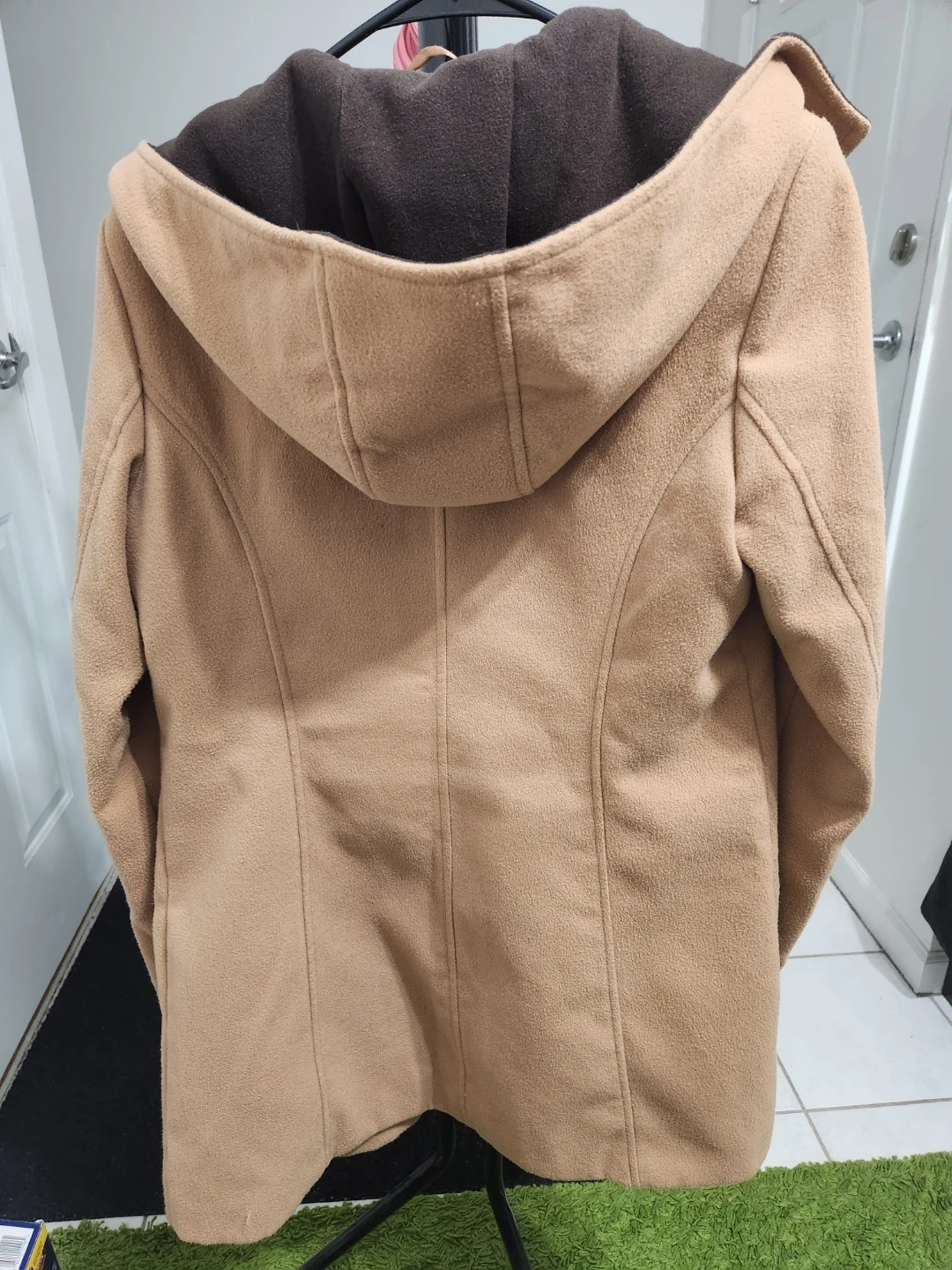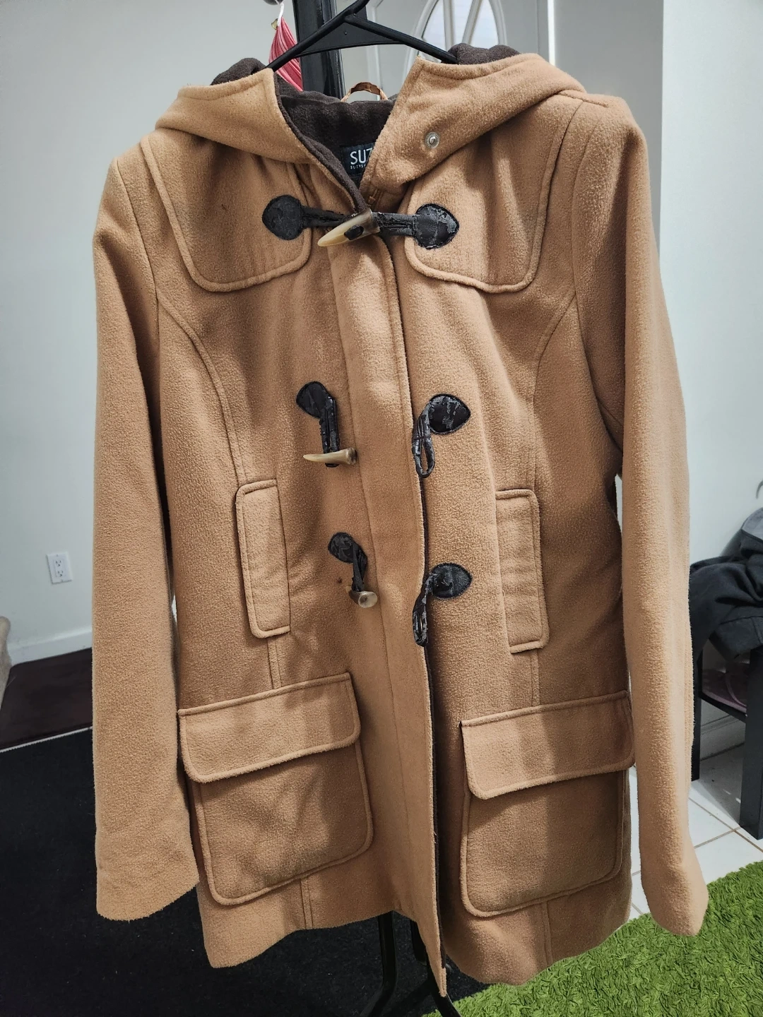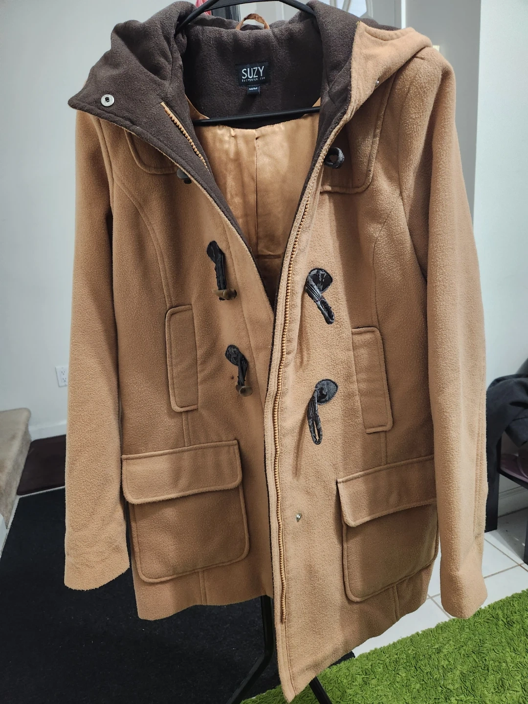 This SUZY duffle coat is a size M/M. It features a tan exterior with a gold satin lining and toggle closures on which the leatherette is peeling off. It's made from a blend of materials for warmth and comfort. Perfect for Spring weather.