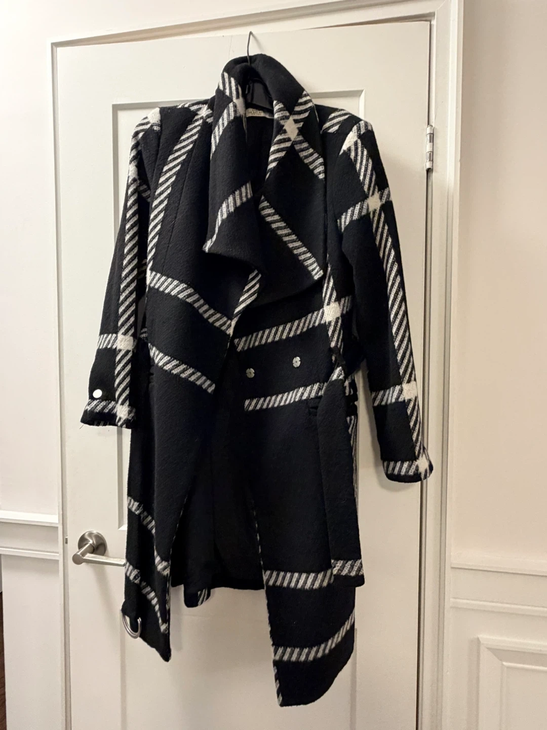 Selling a stylish Plaza coat in a striking black and white plaid pattern. It's in great condition and ready to keep you warm and fashionable this season!
