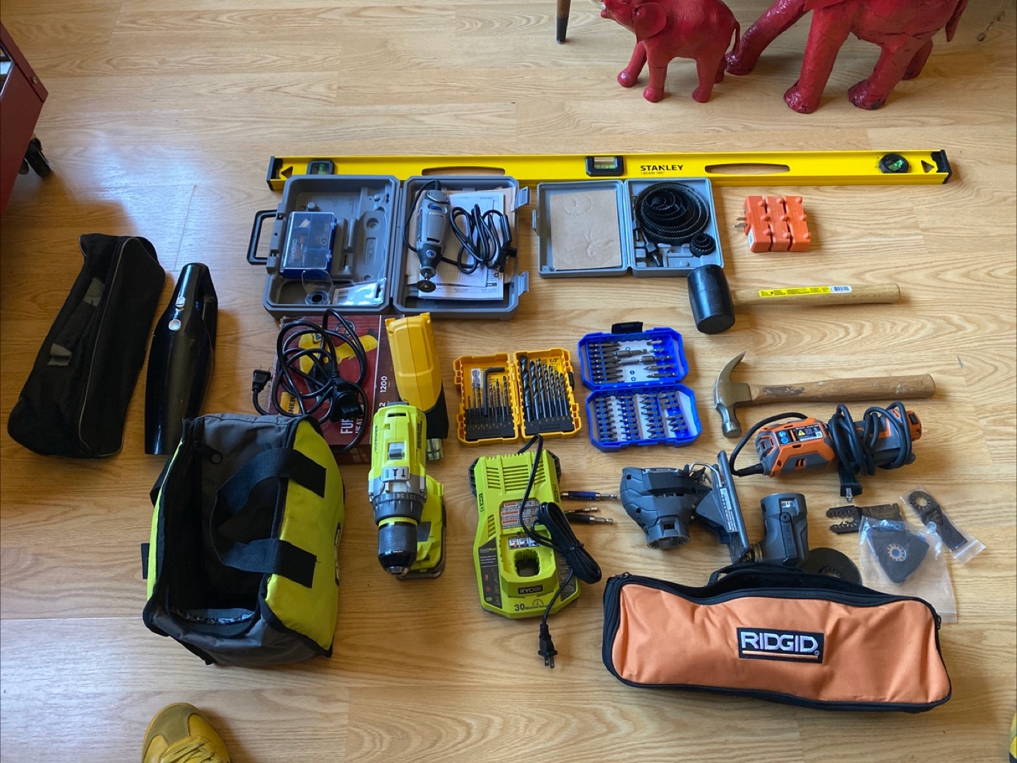 Large lot of power tools and accessories. Includes Ryobi rechargeable drills, a reciprocating saw, oscillating multi-tool, level, hammer, drill bits, and more. Some tools in their original cases. Great for DIY projects or contractors.