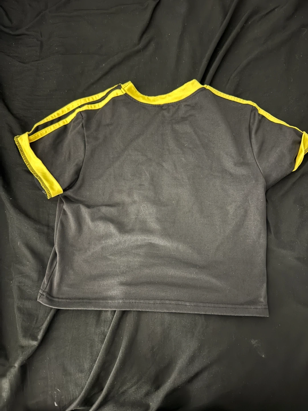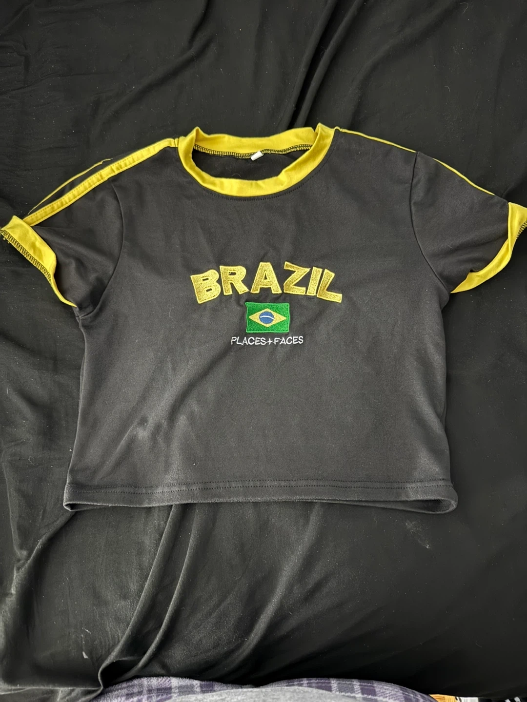 Black t-shirt with "BRAZIL" and the Brazilian flag printed on the front. It's designed with yellow trim on the collar and sleeves. Made from a comfortable fabric.