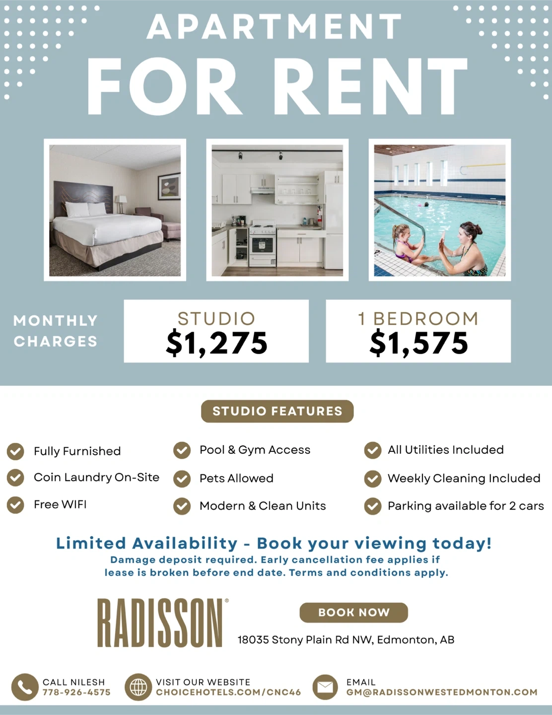 Damage deposit required. Minimum lease term required. Early cancellation fee applies if lease is broken before end date. Terms and conditions apply.