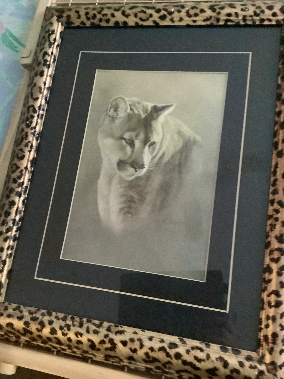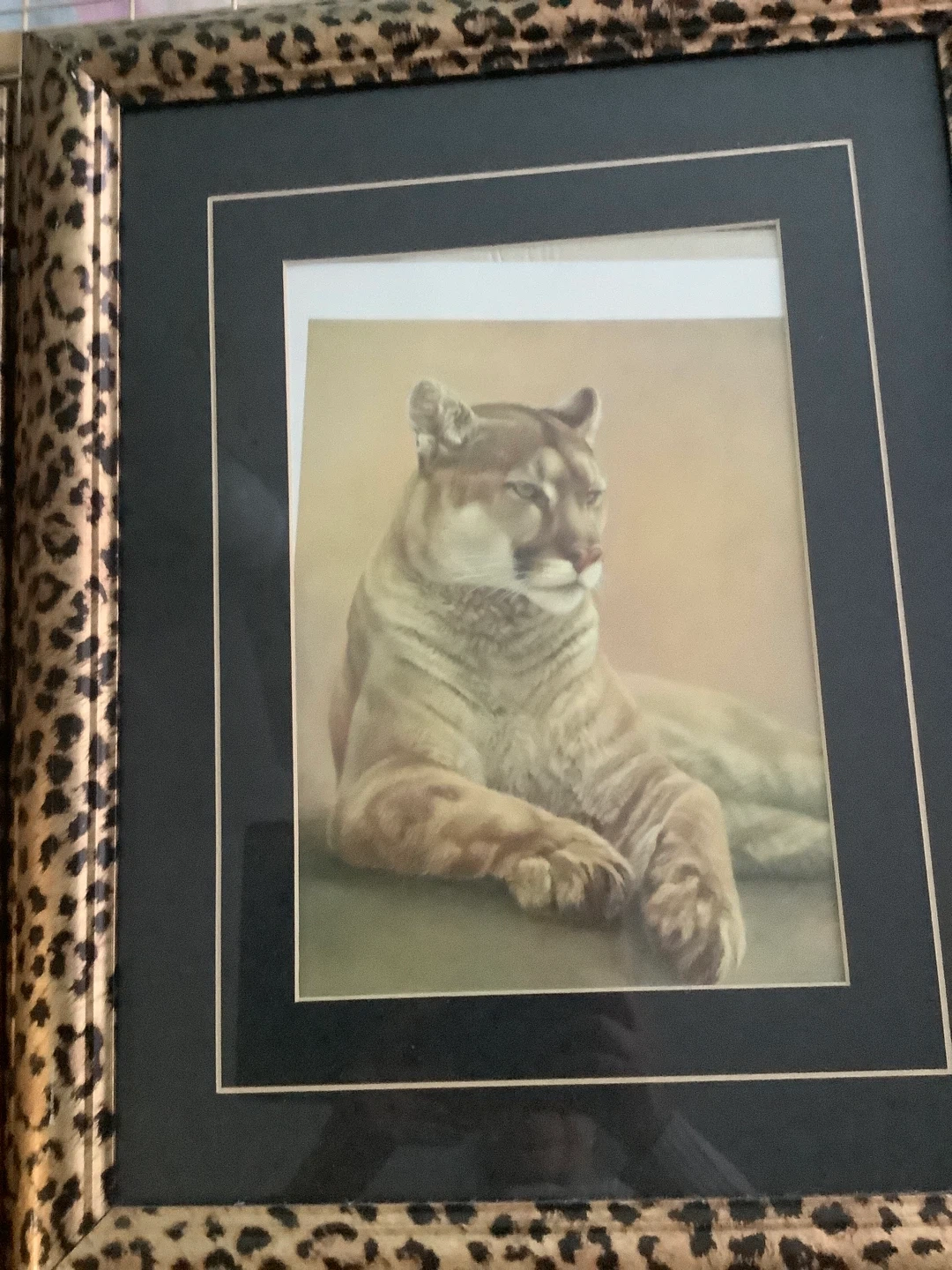 of mountain lions. The artwork is matted and housed in a frame with a leopard print design. Nice pieces for animal lovers. Small ones are 17” x 22”
