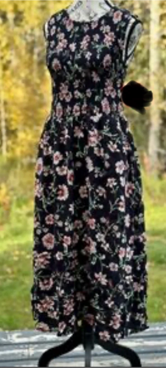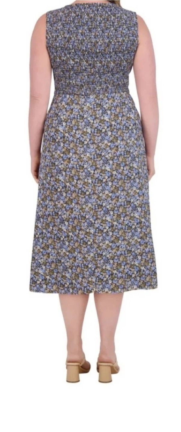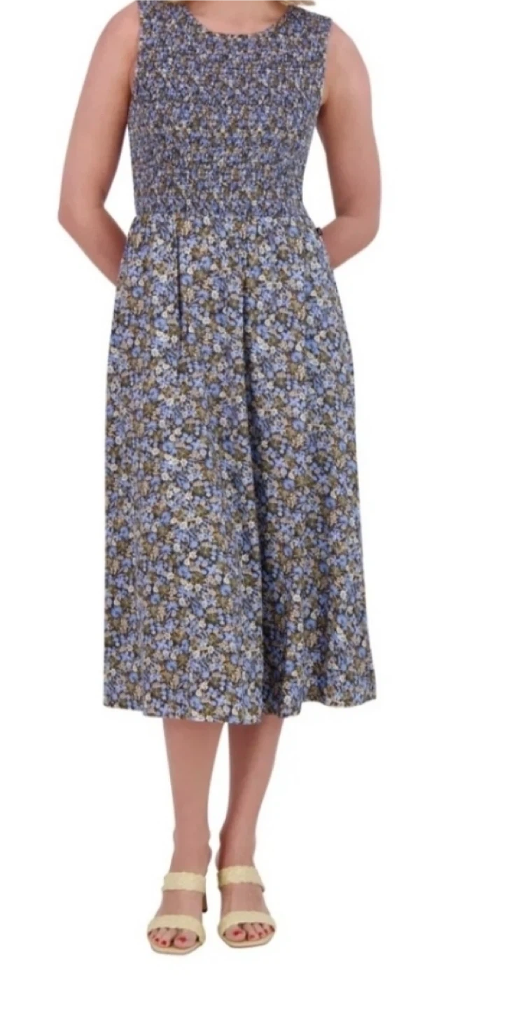 This sleeveless midi dresses from Nautica Jeans features a smocked bodice and a flowy floral skirt. It's made in India. This dress is great for casual outings or a day out!