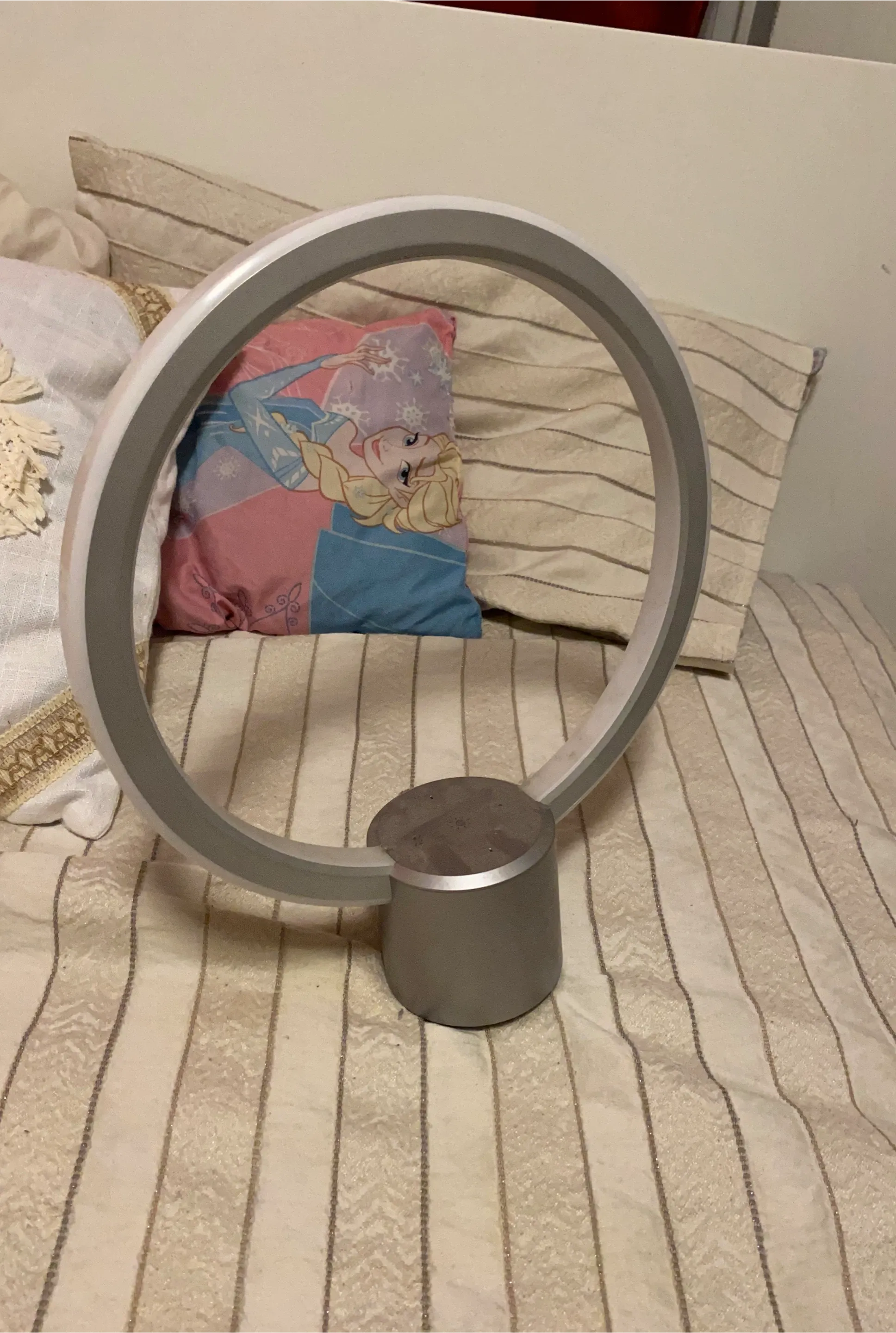 This desk lamp features a unique ring design. It's made of metal and has a brushed silver finish. The lamp's base is circular and steady.