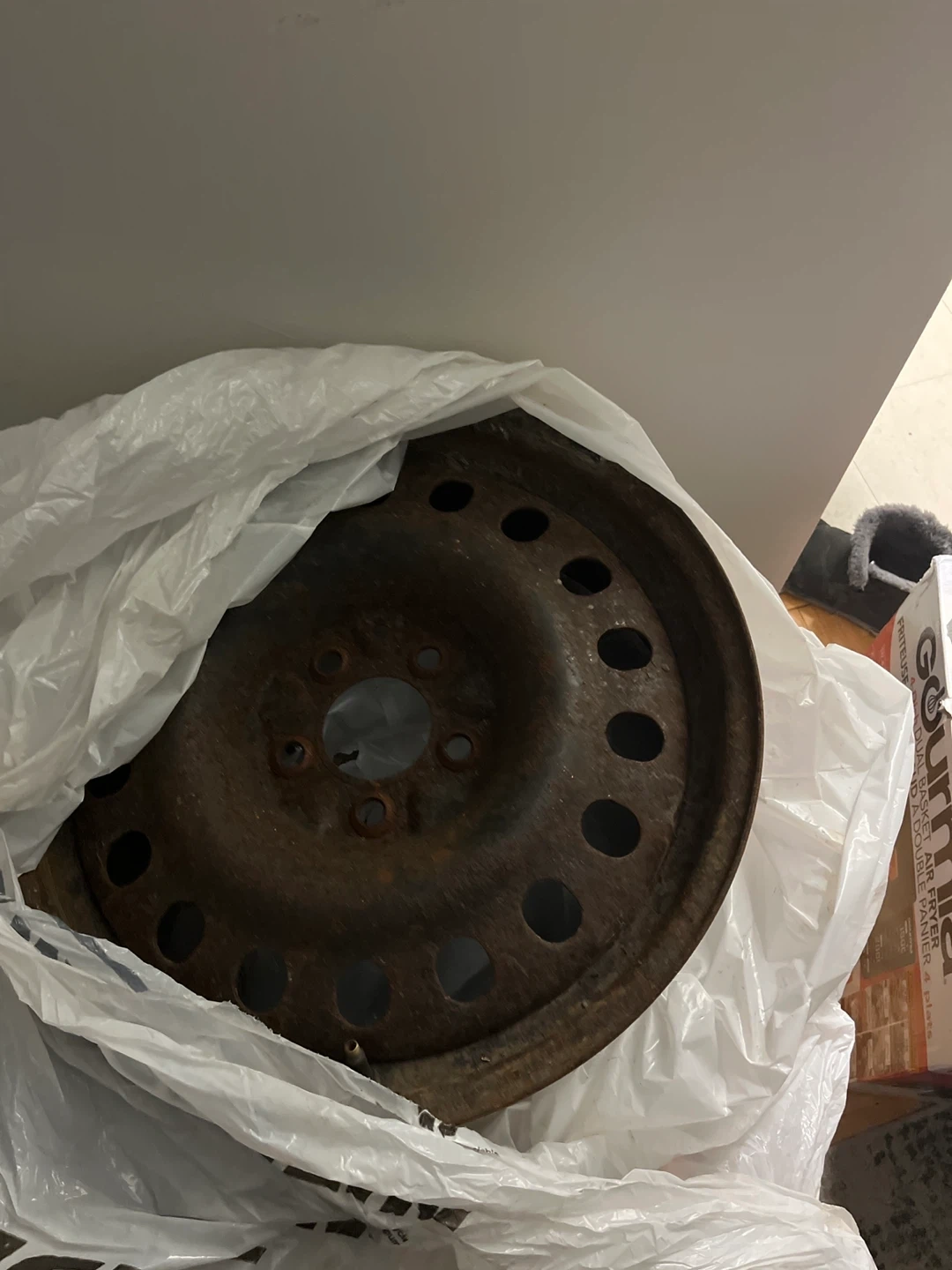 This is a single used steel wheel rim. It appears to be a standard size and has some rust on it. This would be useful as a spare or replacement wheel.