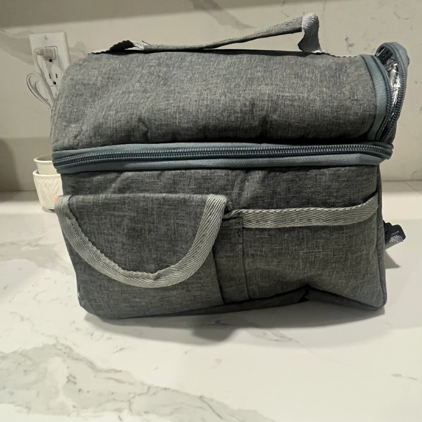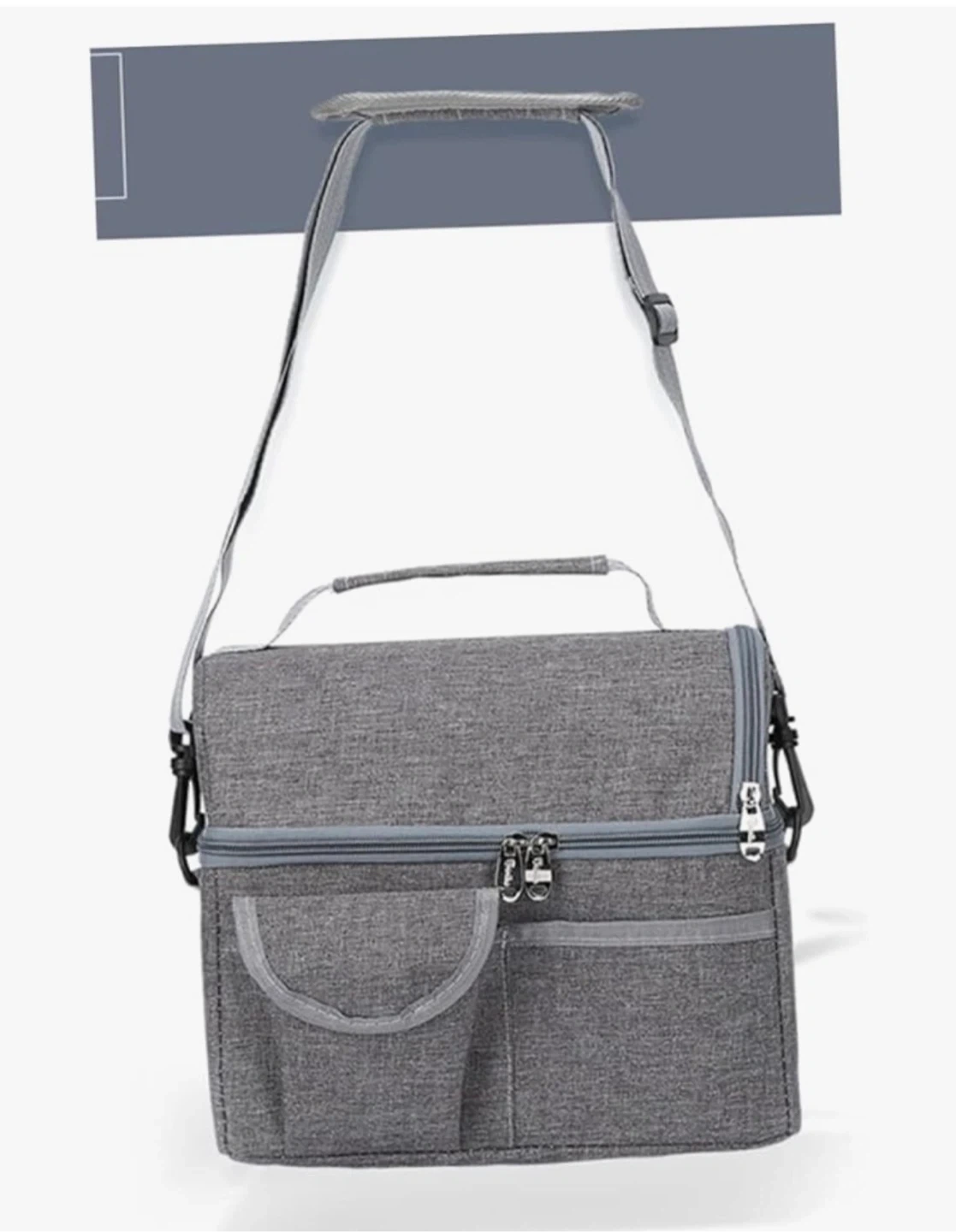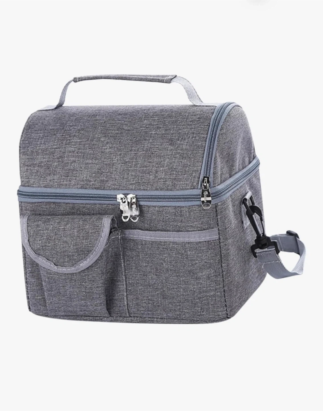 This is an insulated lunch bag in grey. It has a top handle, a detachable shoulder strap, and front pockets for extra storage. The interior is lined with thermal material to keep food and drinks cool.