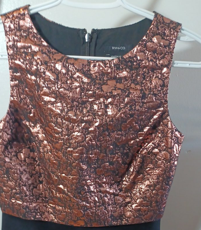 Selling a RW&CO dress with a unique bronze textured top and a sleek black bottom! It’s perfect for a night out or a special occasion. The dress is in great condition and ready for a new home