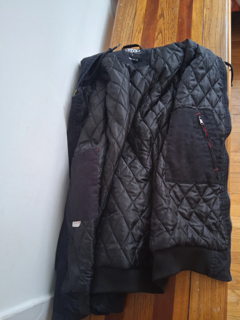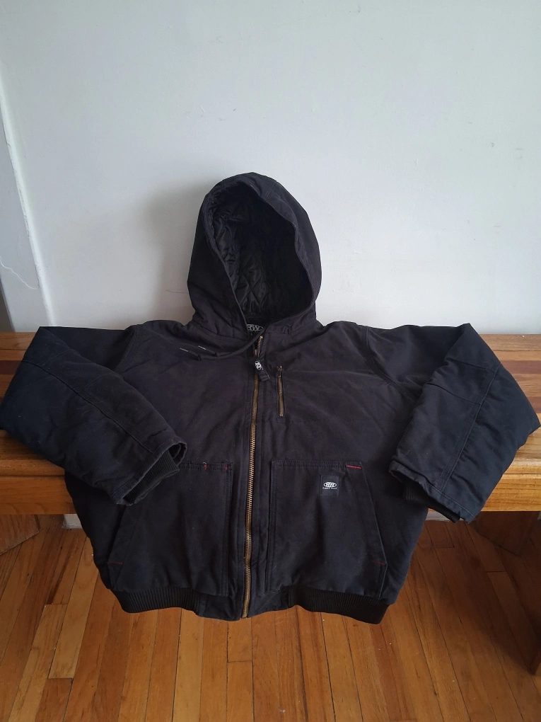 60Selling a black hooded jacket from RW Rugged Wear in size Large. It's in new condition and has a comfortable fit. It features a quilted lining and several pockets.