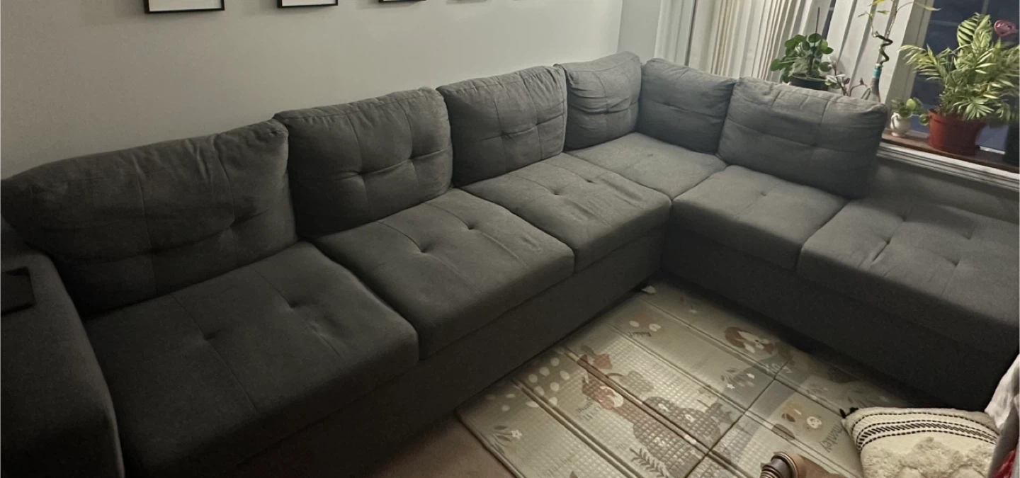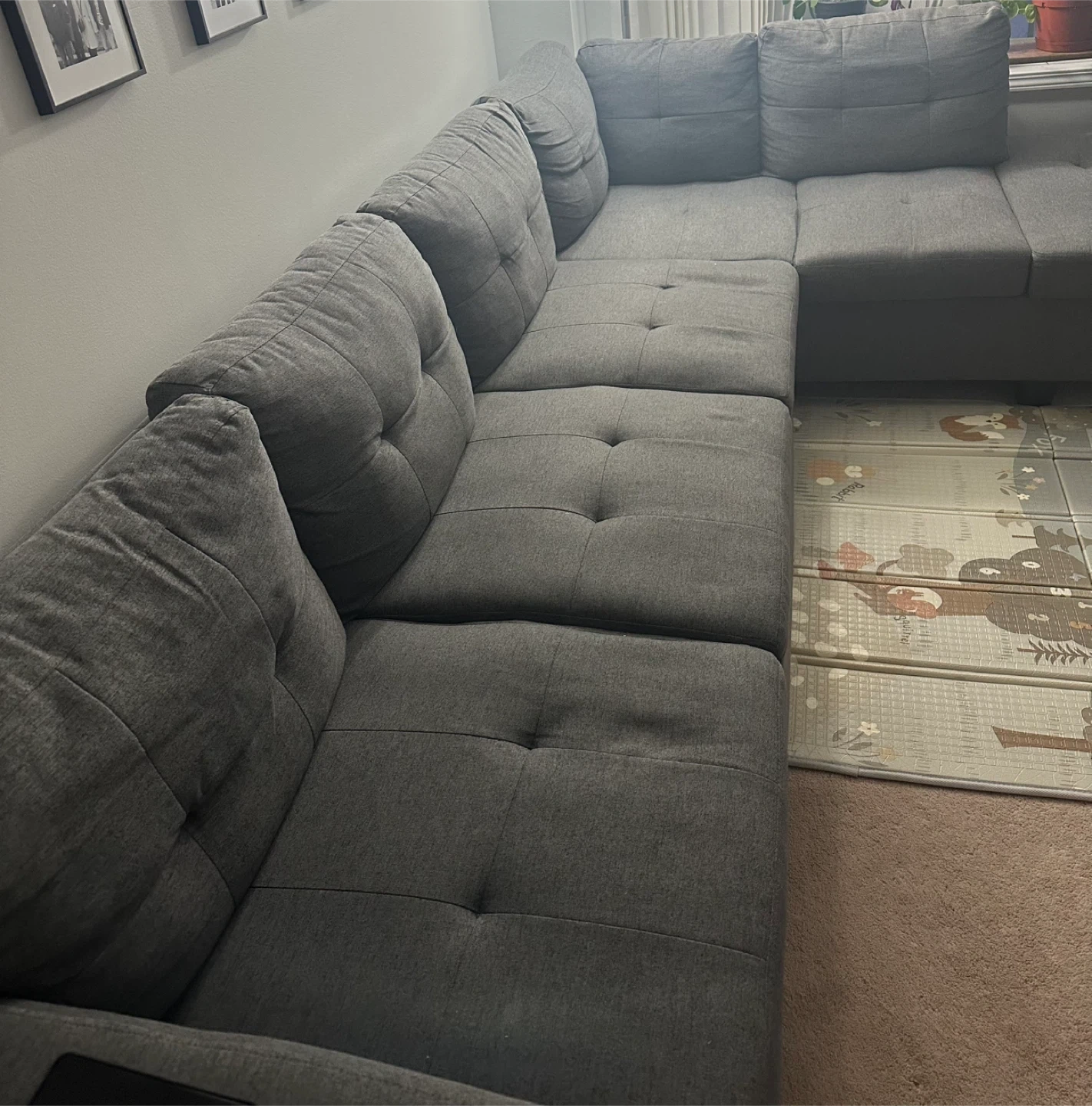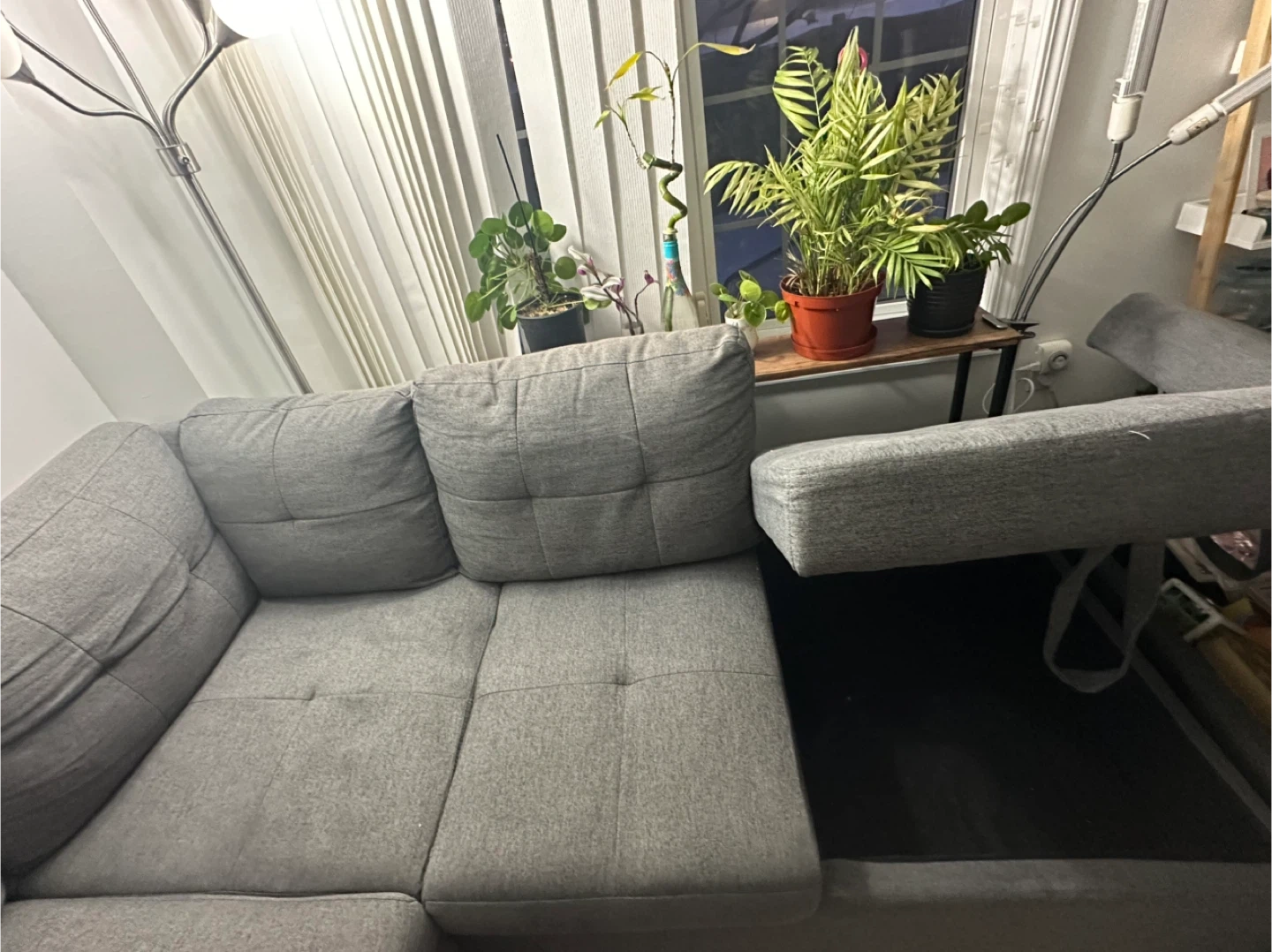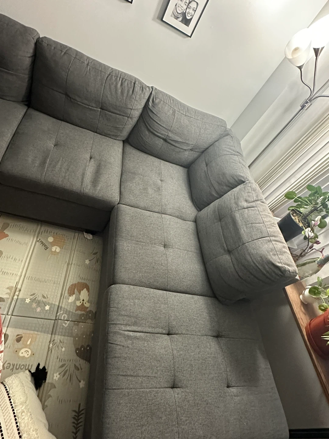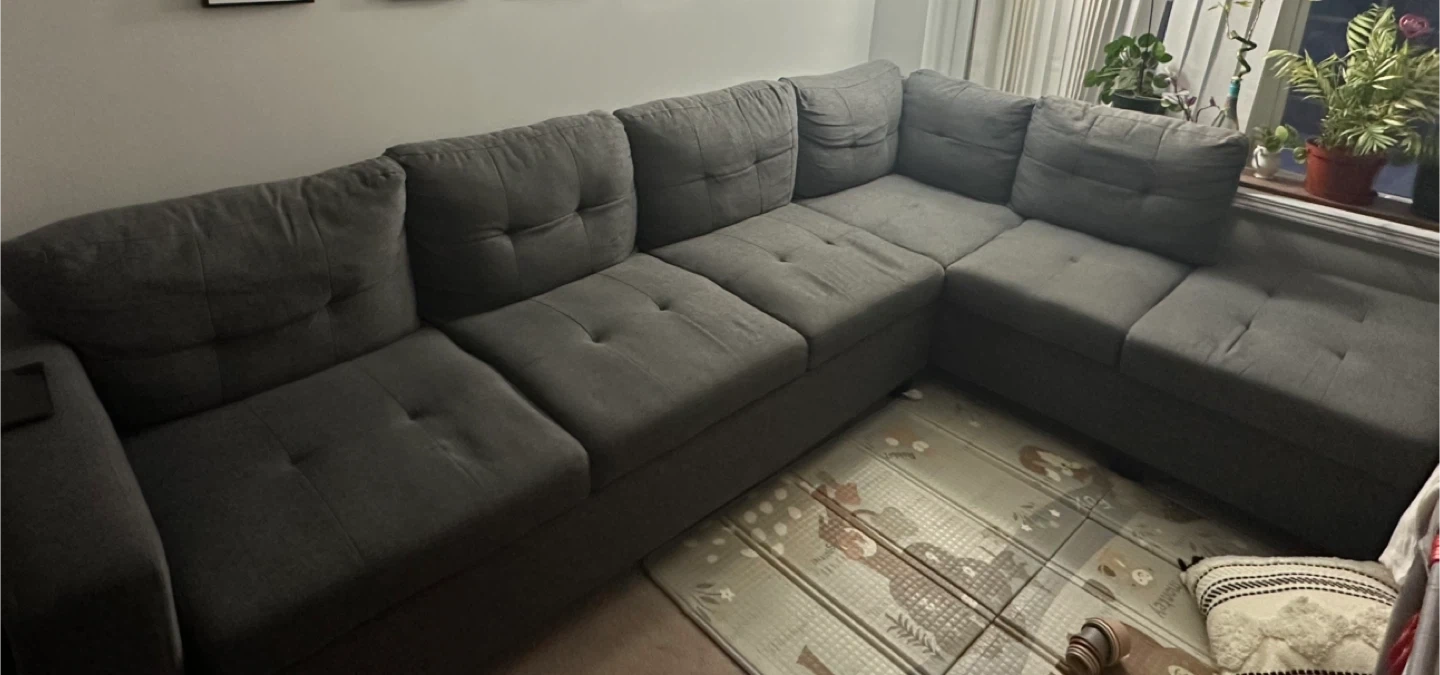 Gray fabric couch in good overall condition, perfect for a living room or basement setup. With built-in storage to keep blankets, pillows, or other items tucked away. One section has slight sagging from regular use, but it doesn’t affect overall comfort. Clean and well cared for. Great value for the price!