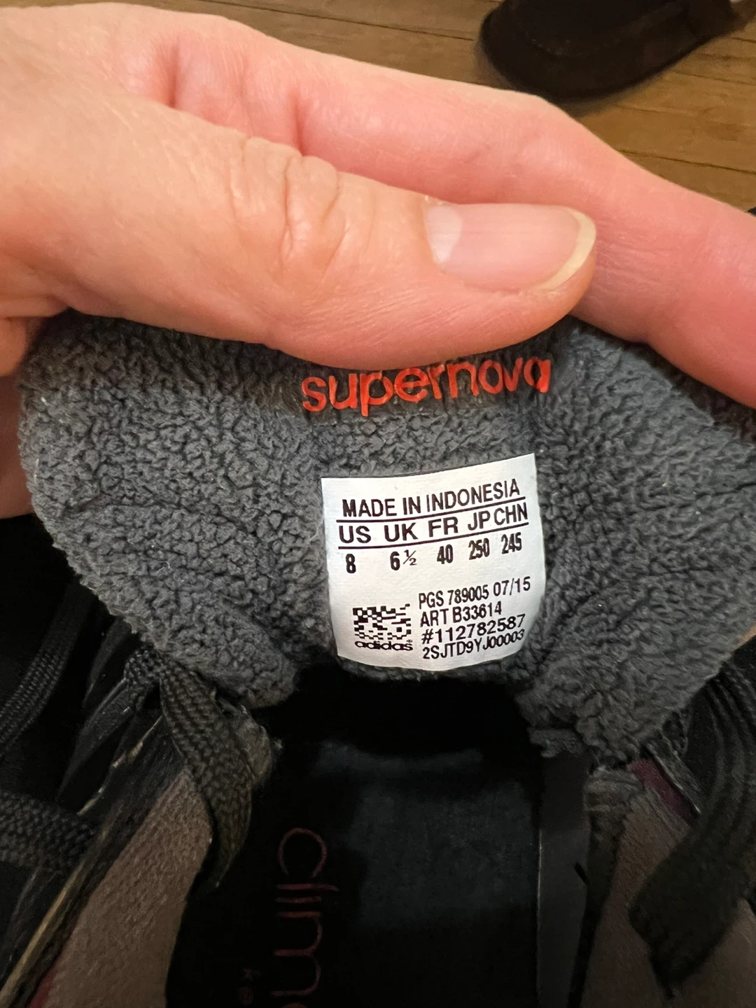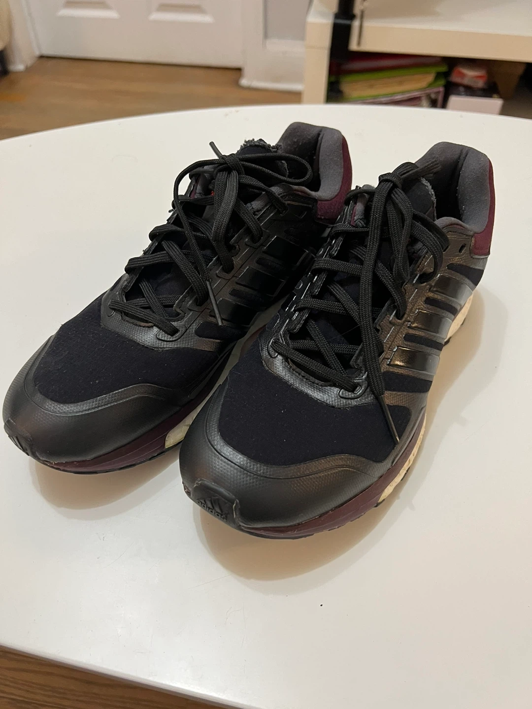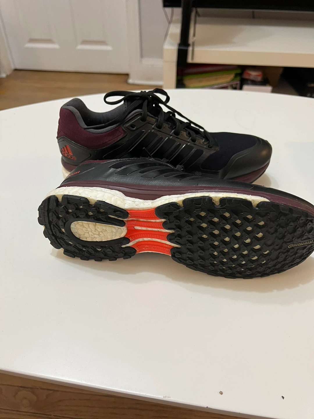 Adidas Supernova Glide running shoes in black and burgundy. US size 8, UK 7.5, EU 40. Made in Indonesia. Features Boost cushioning and Continental rubber outsole. These are great for road running! For both men & women.