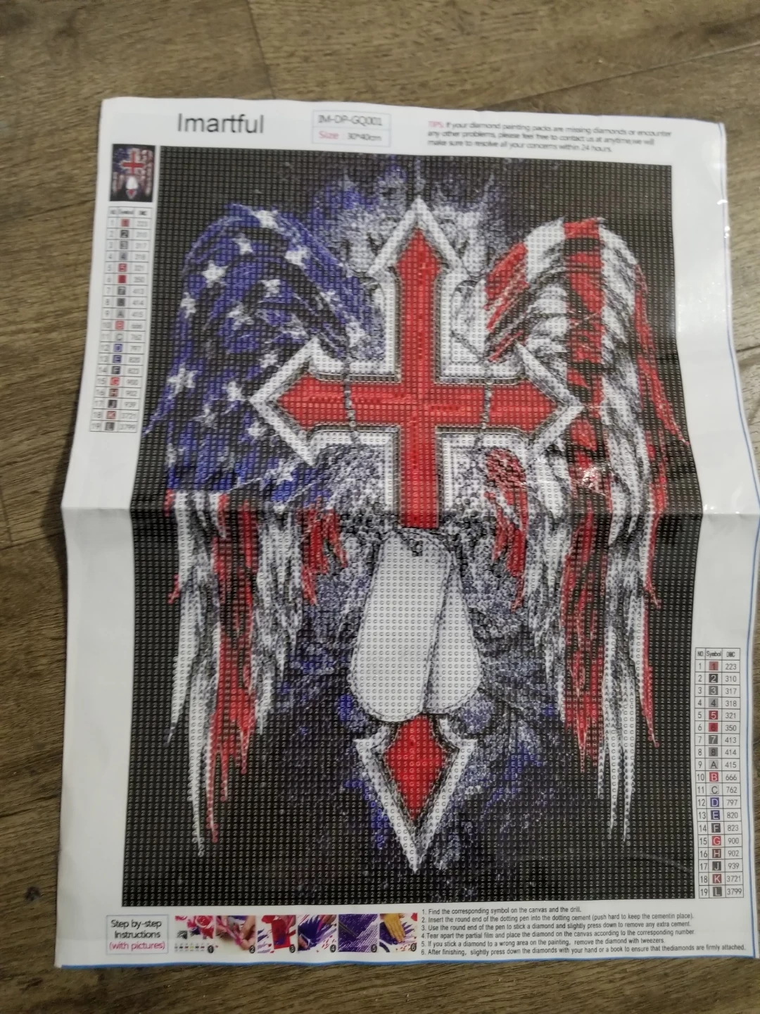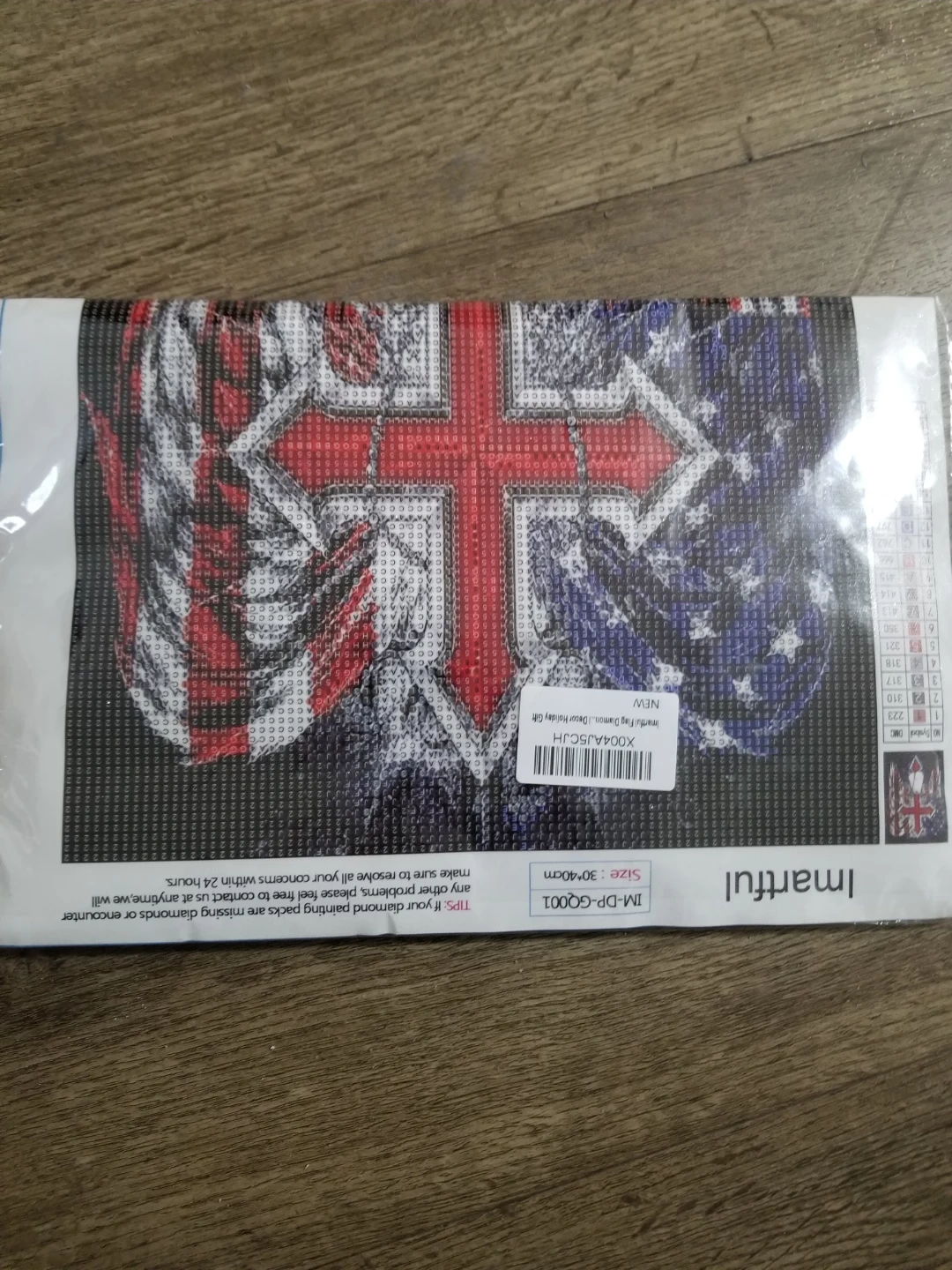 This is an Imartful diamond painting kit featuring a patriotic cross design with American flag wings. It includes all the diamonds and tools needed for the craft. The canvas size is 30x40cm. Brand new