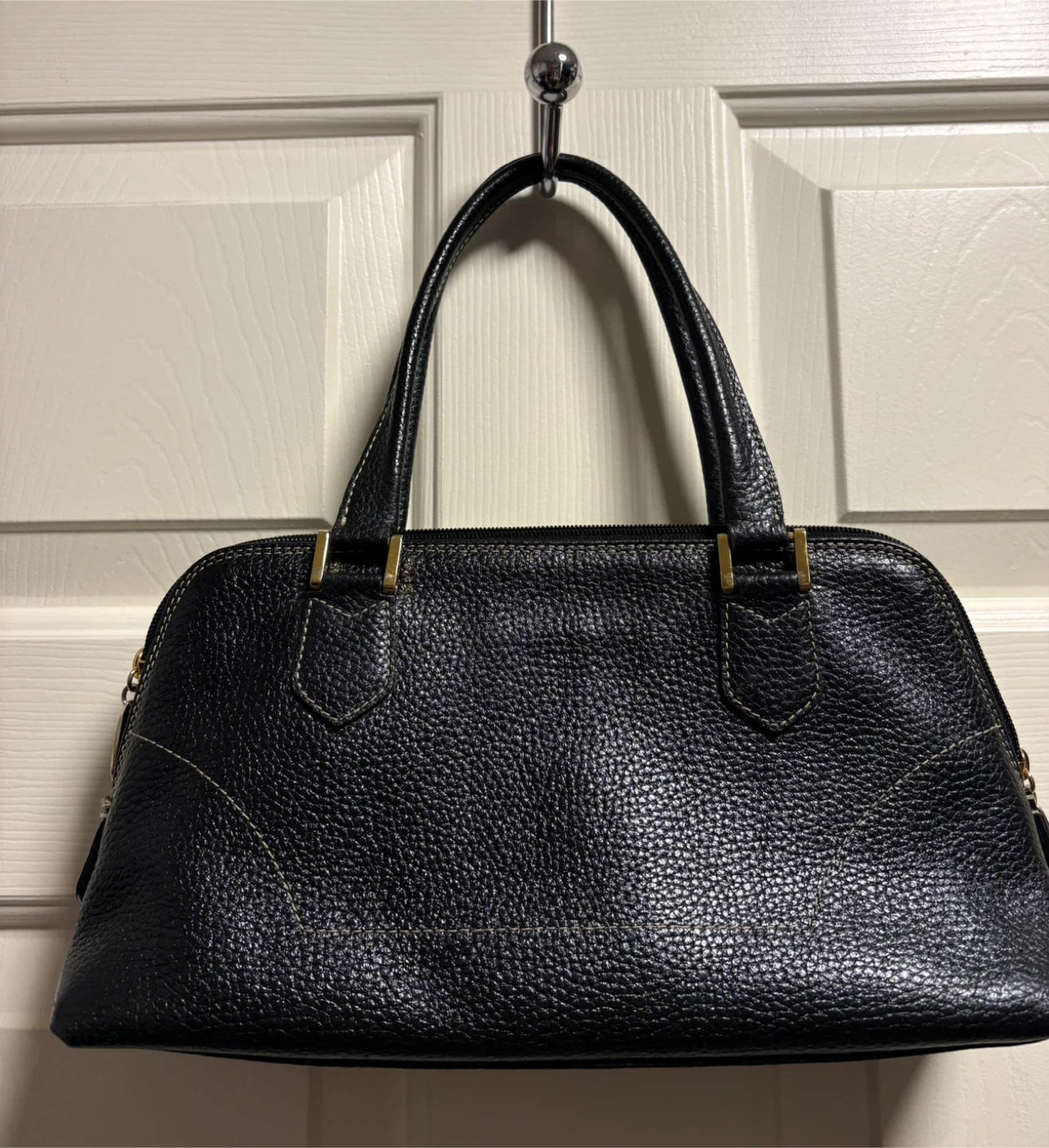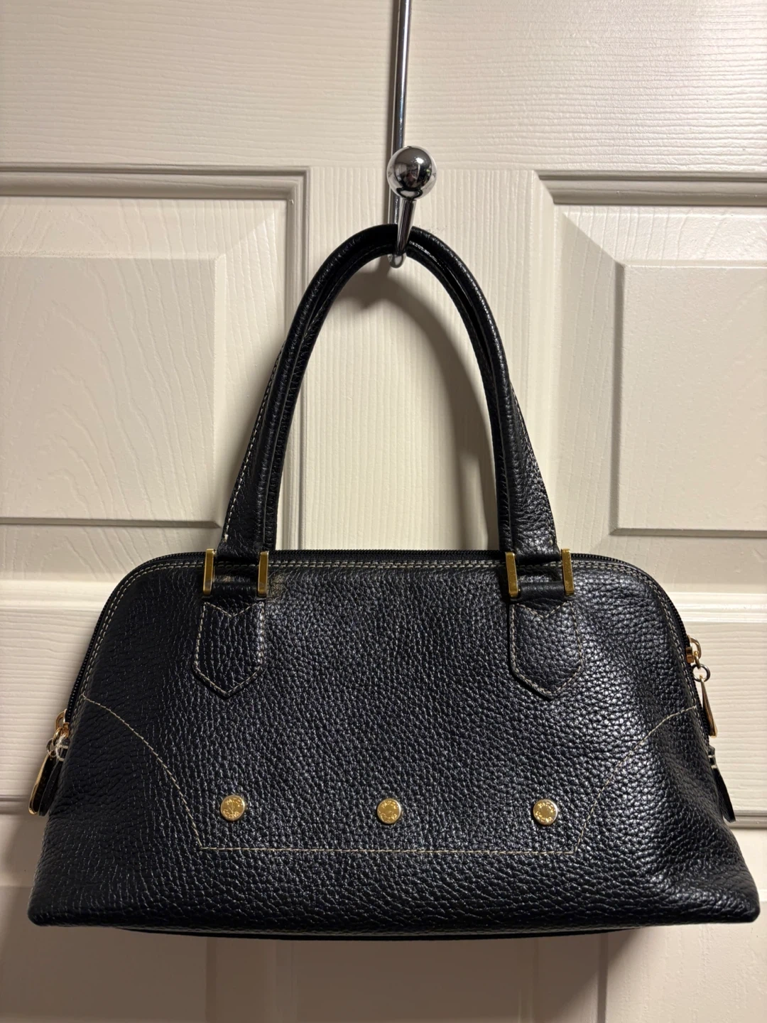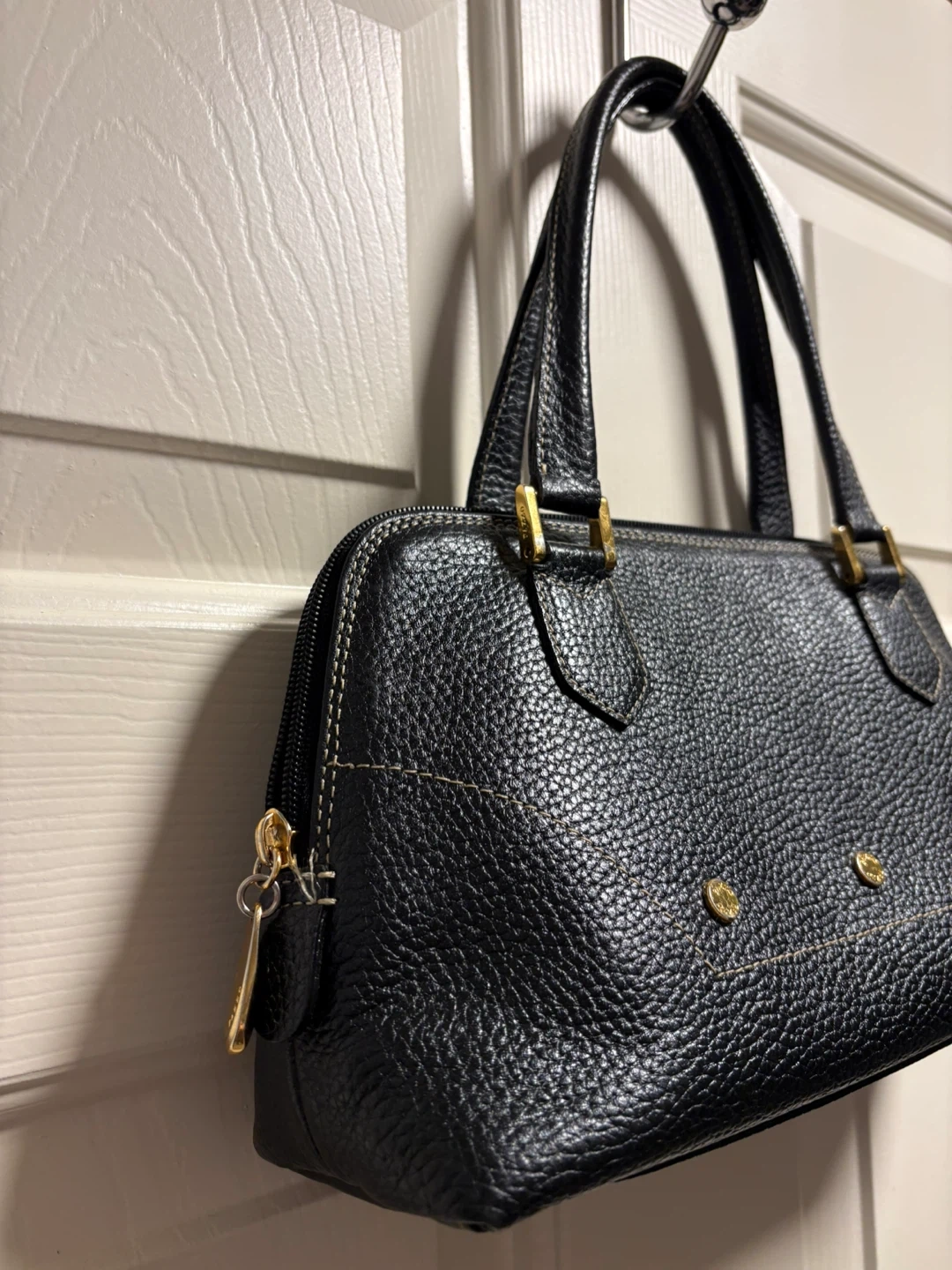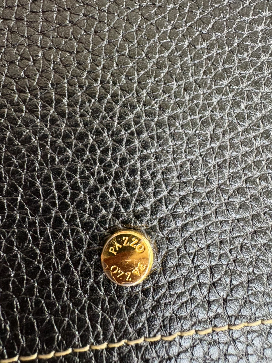 A classic black pebbled leather handbag by PAZZO ITALY. It features gold-tone hardware and a zip-top closure. This Italian-made purse is crafted from genuine leather. Beautiful and classy handbag in great condition, just like new! Pick up in Chestermere.