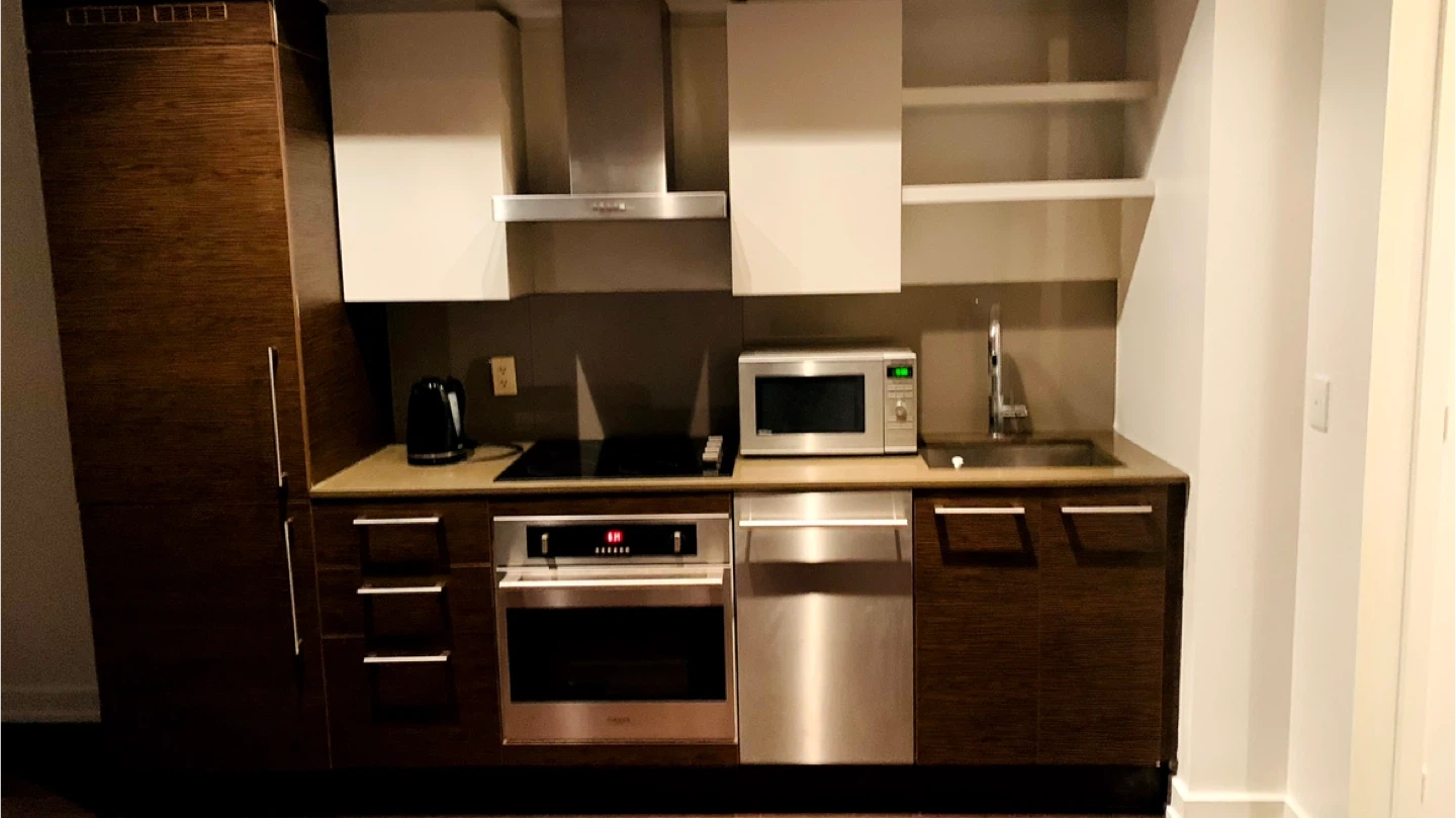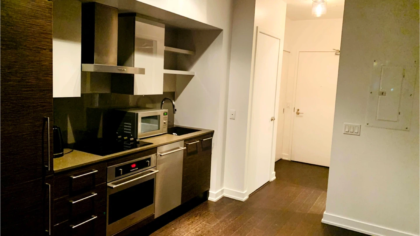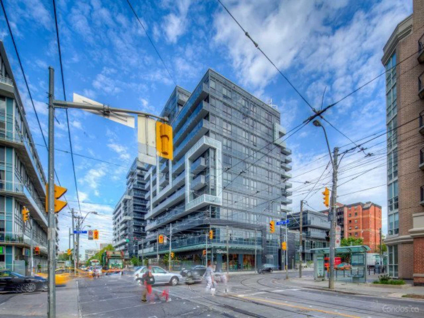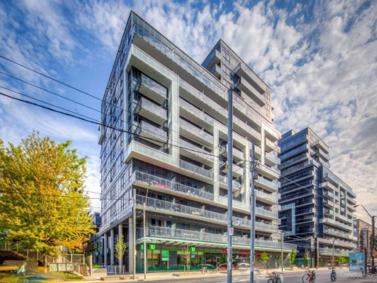 Modern condo building located at 1030 King Street West, Toronto. Features contemporary architecture and commercial spaces on the ground floor. Convenient urban location with easy access to amenities. Great for city living!