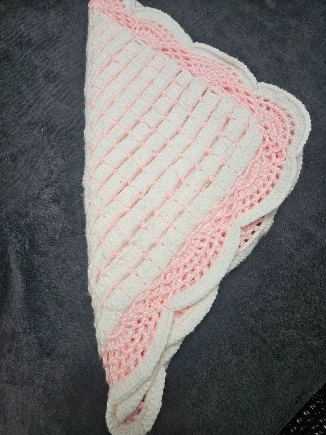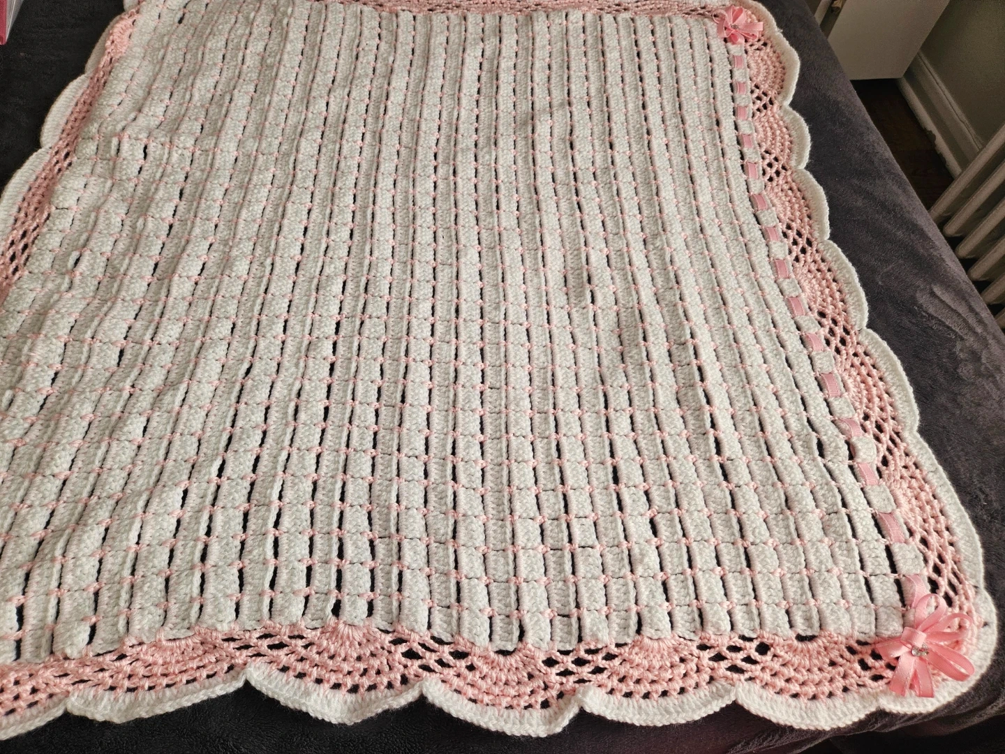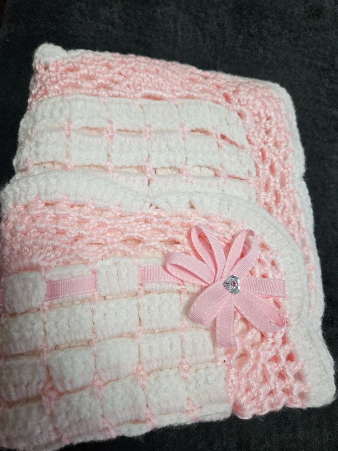 Selling a sweet, handmade crochet baby blanket in soft pink and white. It's in great condition and perfect for keeping your little one cozy and warm. The scalloped edge and ribbon accents add a lovely touch!