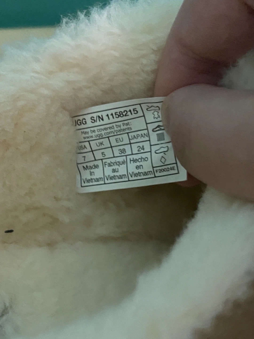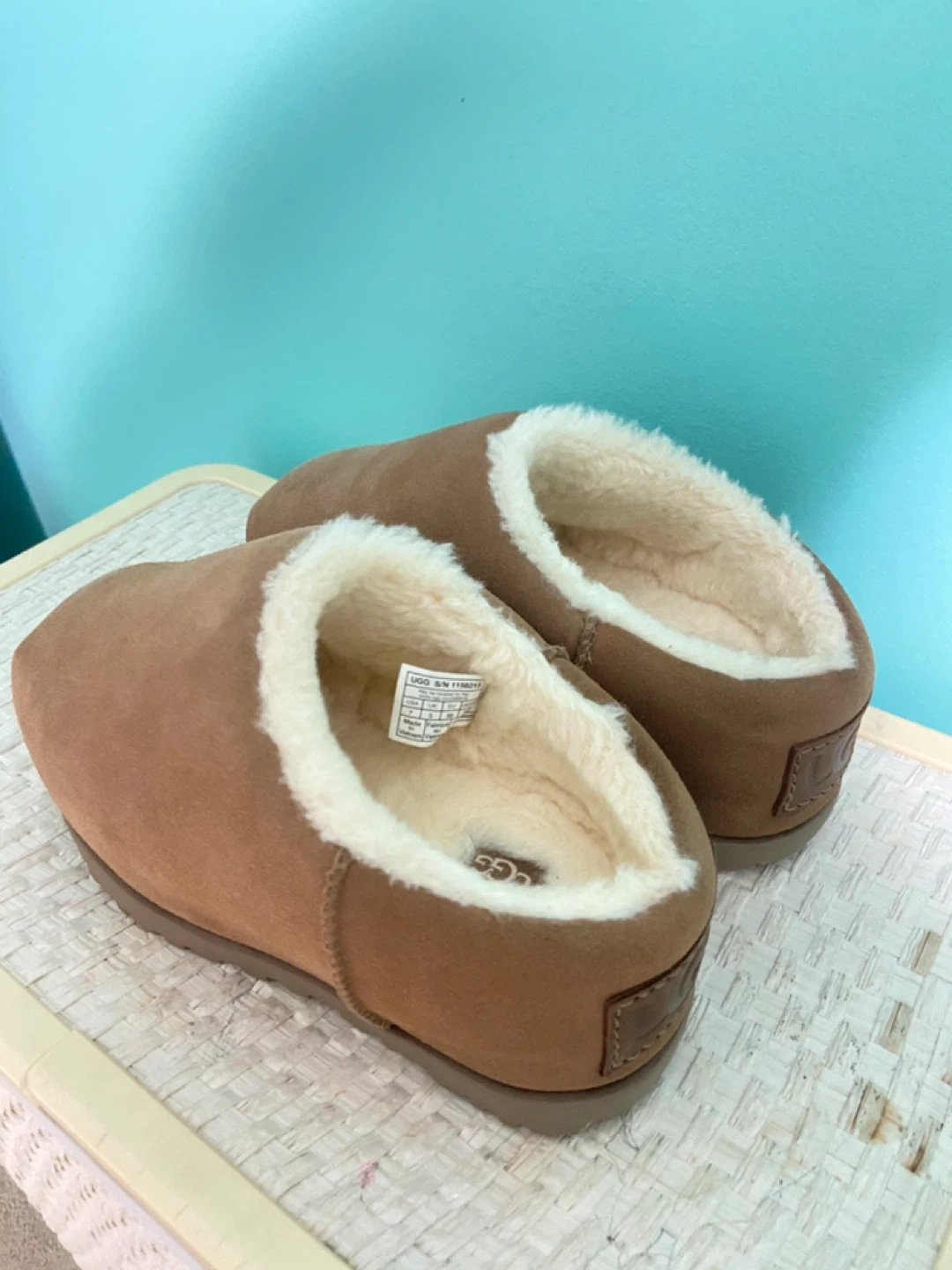 Cozy Ugg slippers in a Chestnut colour. These are a women's size 7, featuring a soft sheepskin lining and a comfortable sole. Perfect for keeping your feet warm indoors or outdoors!
