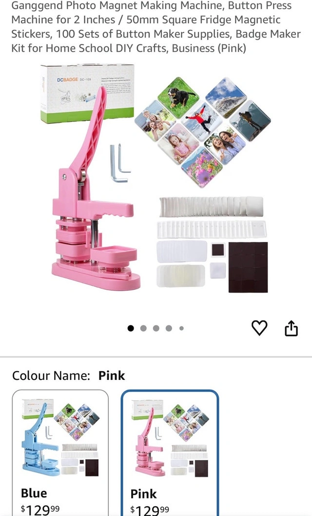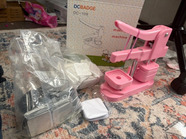 Button press machine for 2 inches / 50mm square fridge magnetic stickers. Includes 100 sets of button maker supplies. Great for home, school DIY crafts, or business. Pink color. Pickup in Barrhaven.