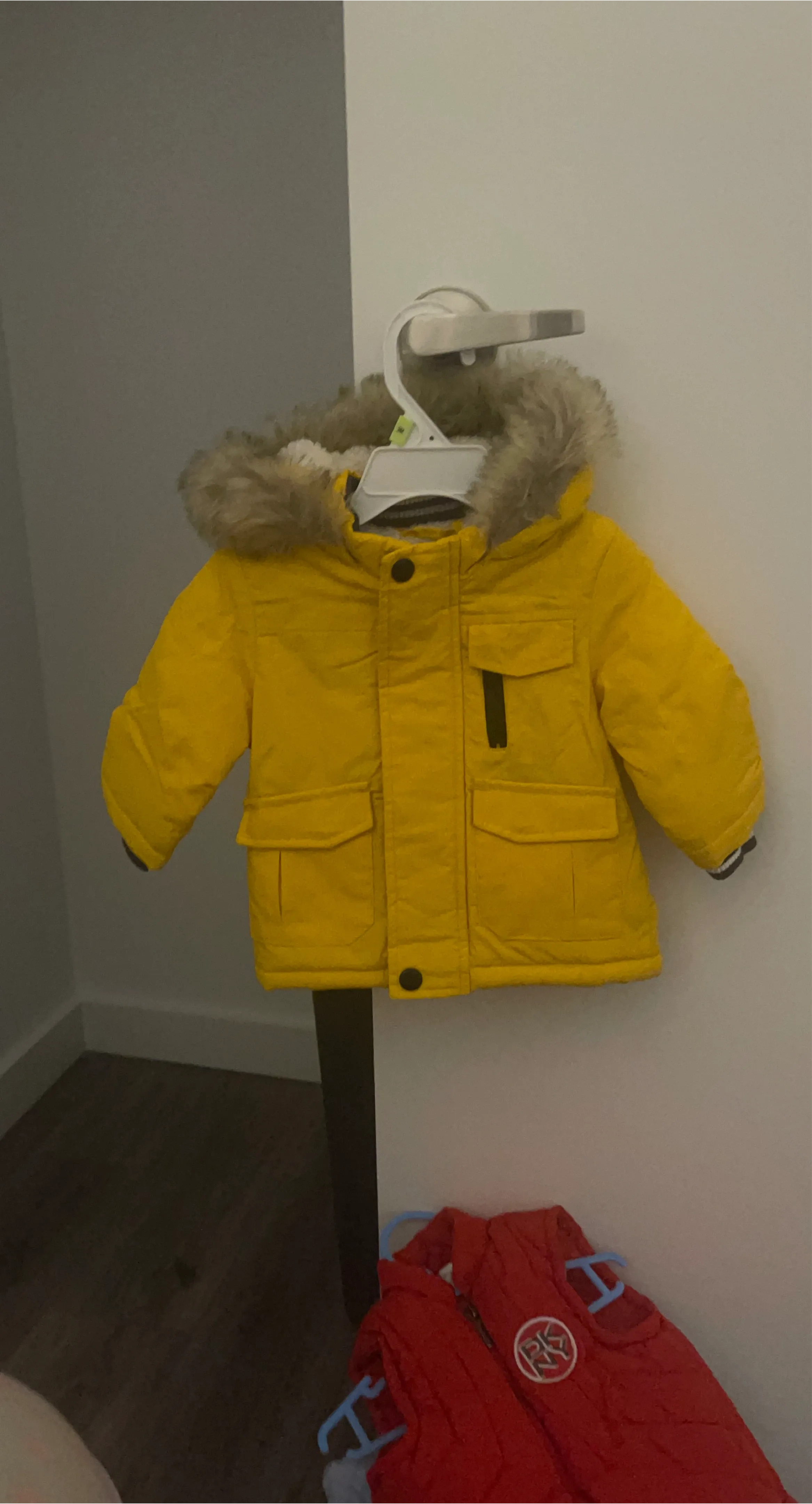Cozy yellow winter parka jacket for boys. It features a faux fur-lined hood and multiple pockets for warmth and convenience. This jacket is designed to keep him comfortable during colder months!