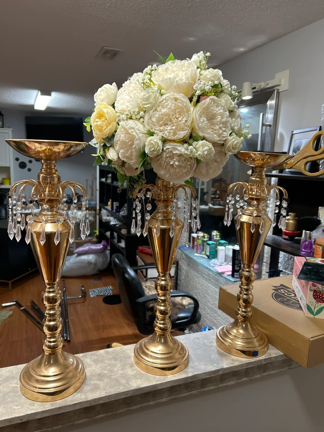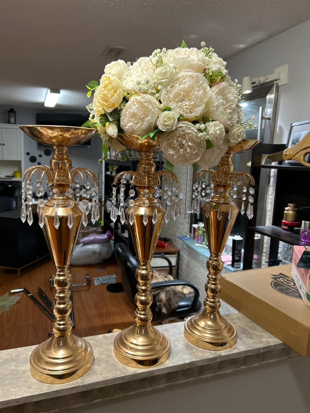 Elegant gold centerpieces with sparkling crystal droplets. These add a touch of glamour to any event or home decor. They're perfect for weddings, parties, or special occasions!