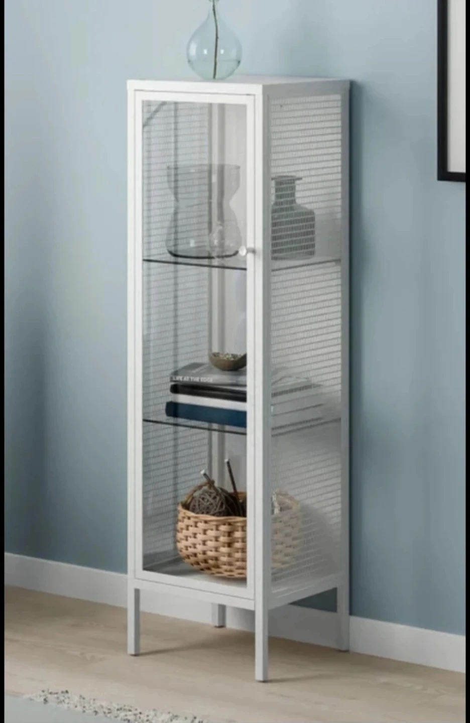 This IKEA FABRIKÖR cabinet is white with glass doors and shelves. It's great for displaying items or for storage. The dimensions are 17.75" x 15.375" x 56.625".