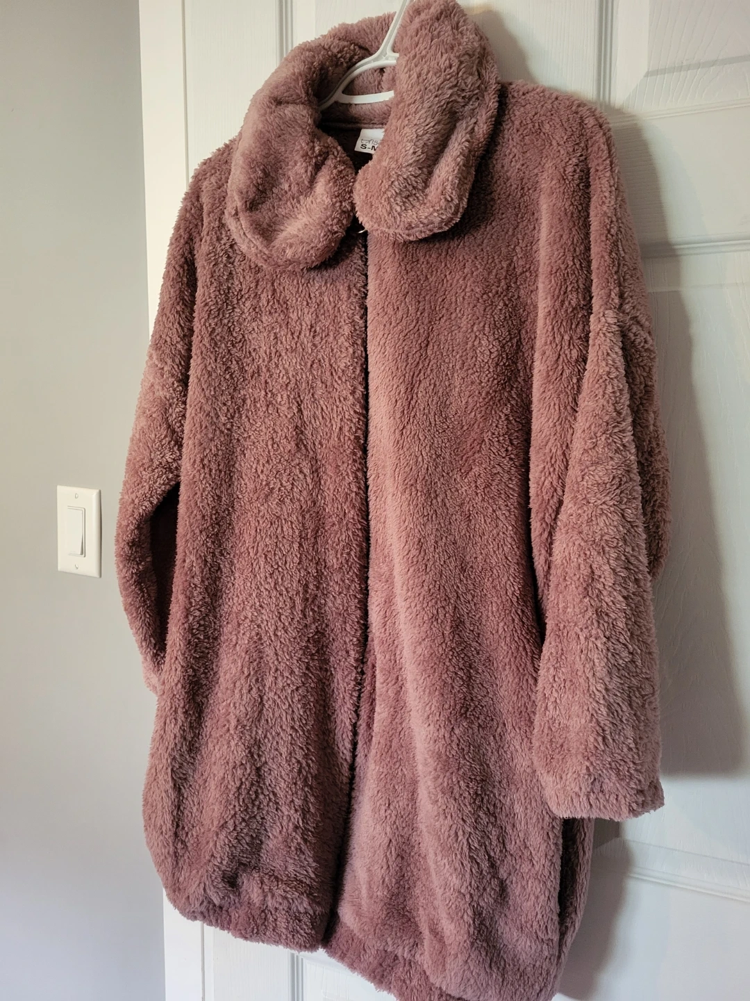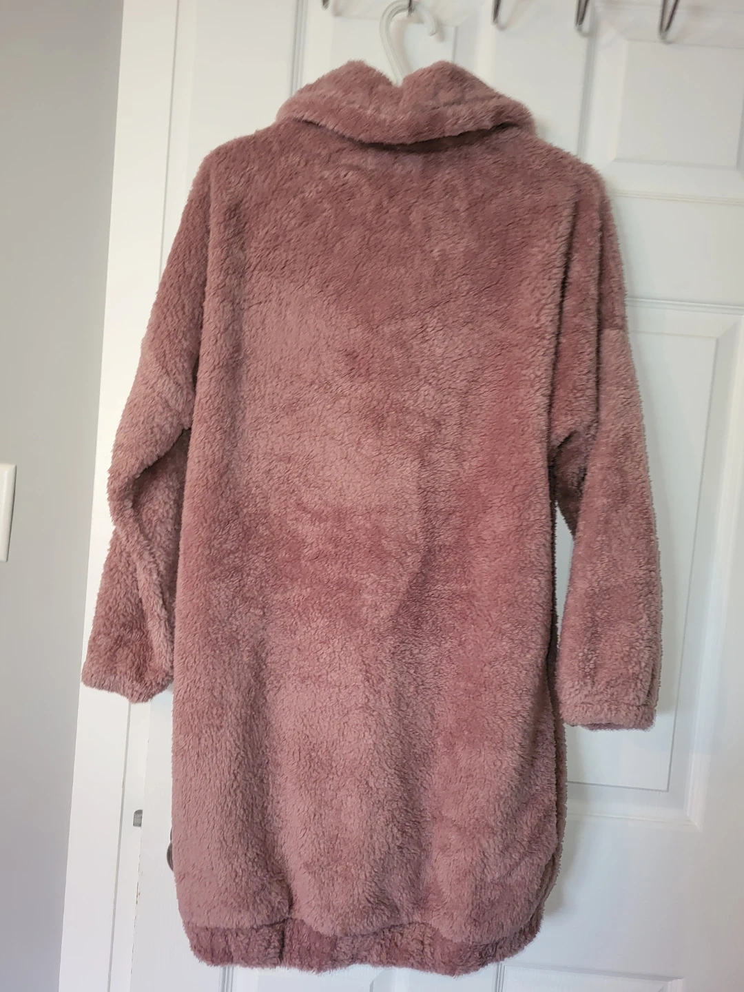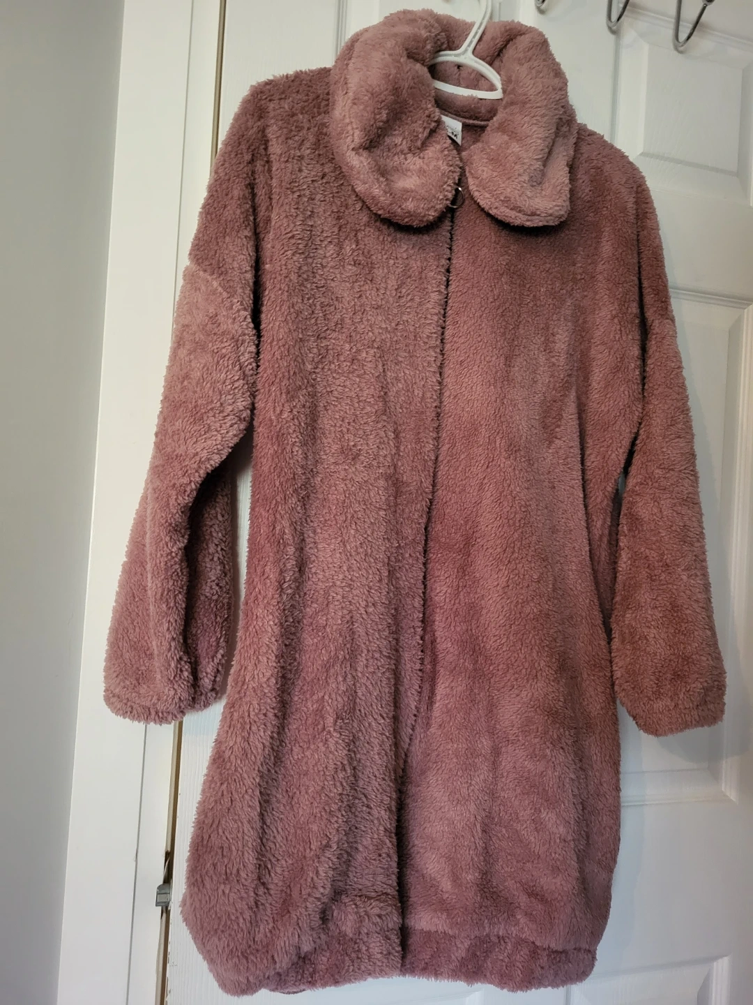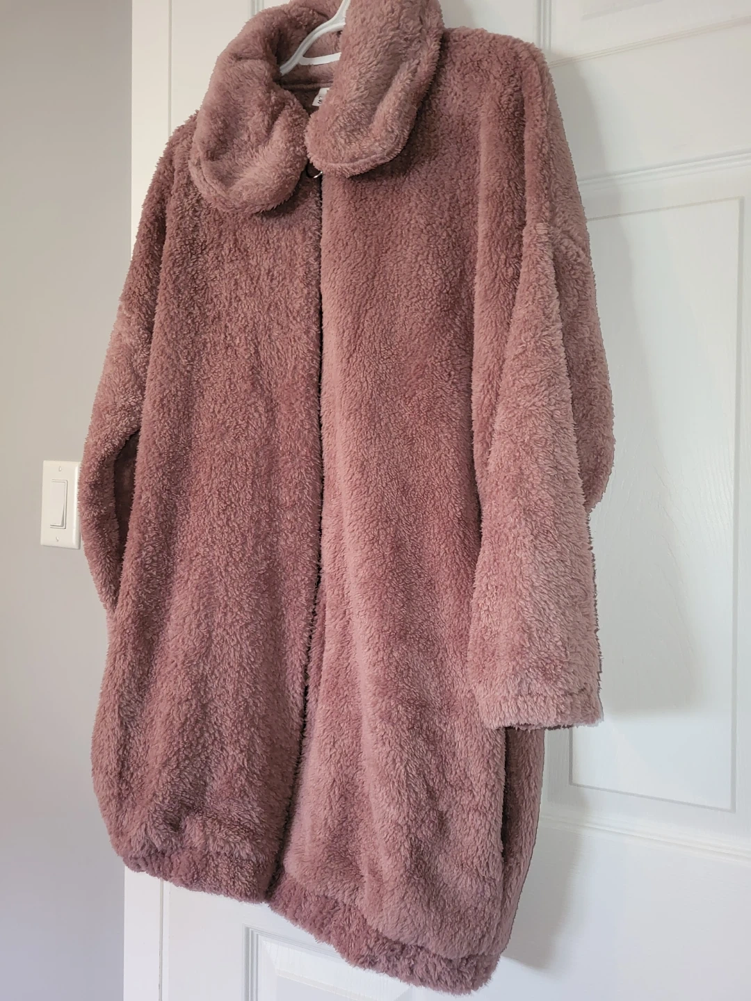 Cozy pink sherpa fleece coat. It has a large collar and two front pockets. Made with a soft, plush material for warmth. Size is S/M. $35 firm.
