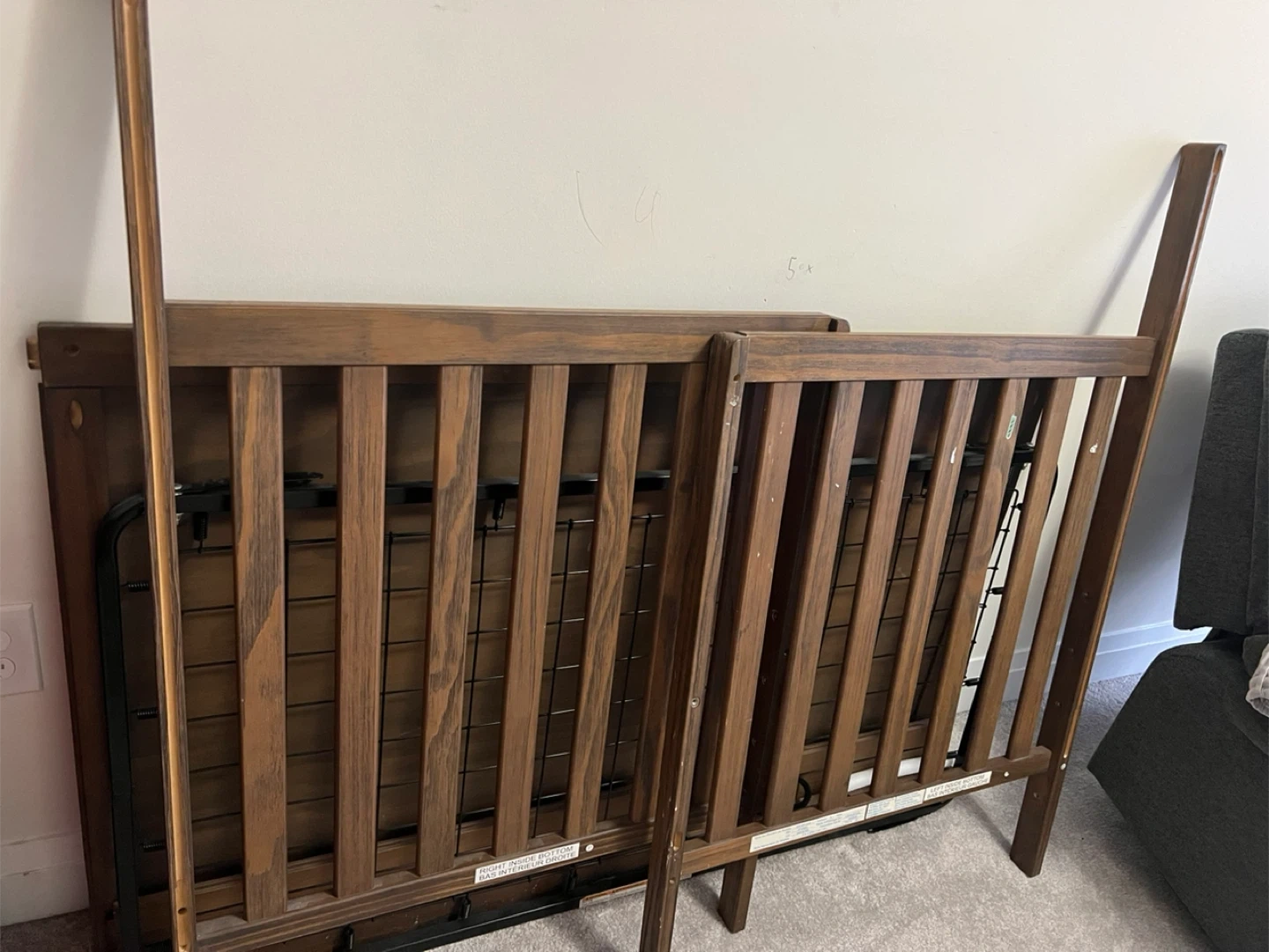 This is a sturdy wooden crib for babies. It's made from dark wood with a slatted design. The crib comes with a mattress that appears to be in good condition. It's a safe and reliable option for your little one.