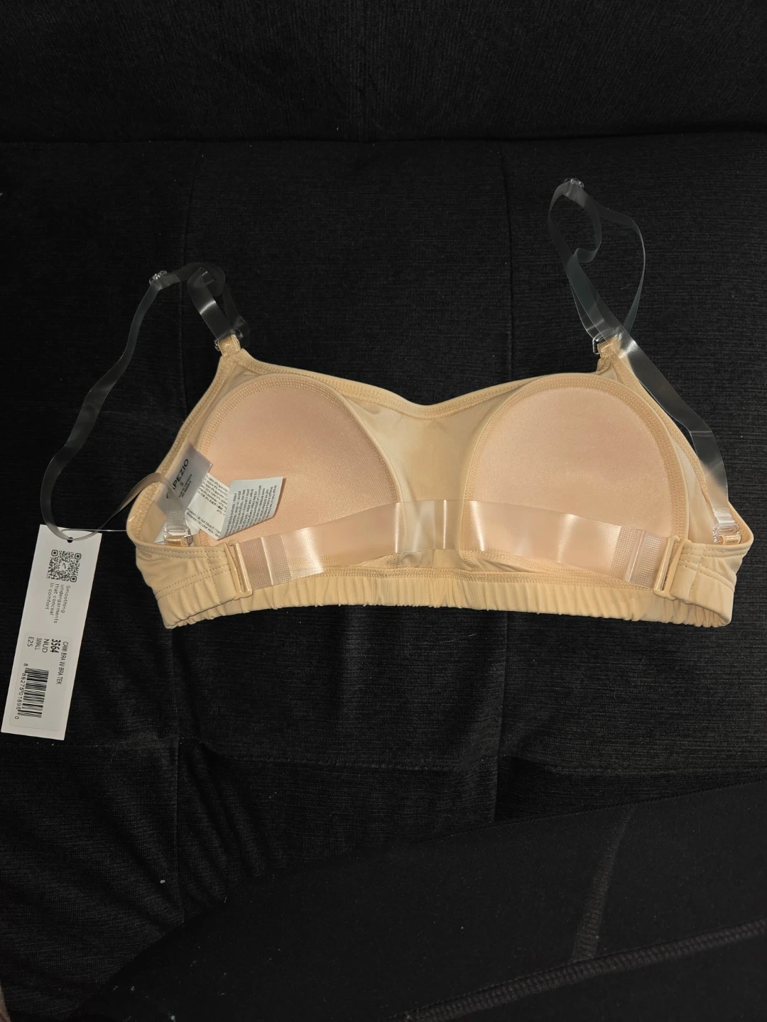 This is a nude-coloured Capezio dance bra. It features adjustable, clear shoulder straps and a comfortable elastic band. It's made with a blend of nylon and spandex for flexibility.