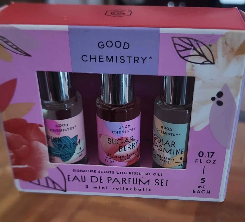 Good Chemistry Eau de Parfum Set with 3 mini rollerballs. Scents: Includes Pink Palm, Sugar Berry, and Solar Jasmine. Each rollerball contains 0.17 fl oz (5 mL) of product. Made with essential oils, vegan, cruelty-free, and free from parabens and propylene glycol. Sugar Berry has notes of freesia, raspberry, and vanilla. Solar Jasmine features notes of pineapple, peach blossom, and sandalwood. These all smell amazing!
