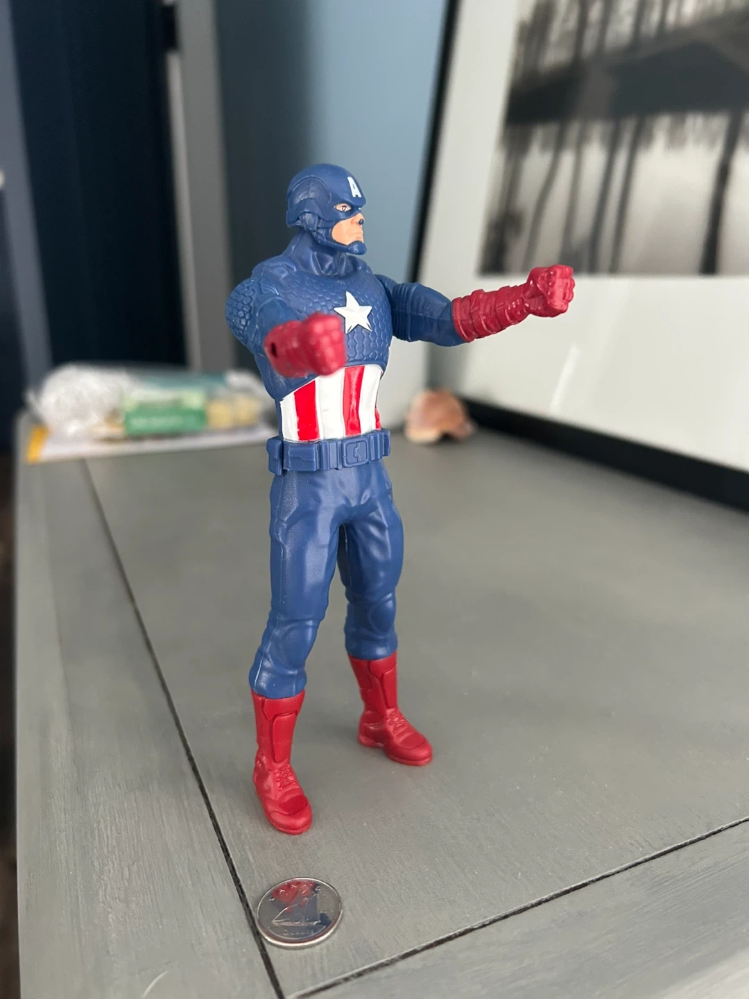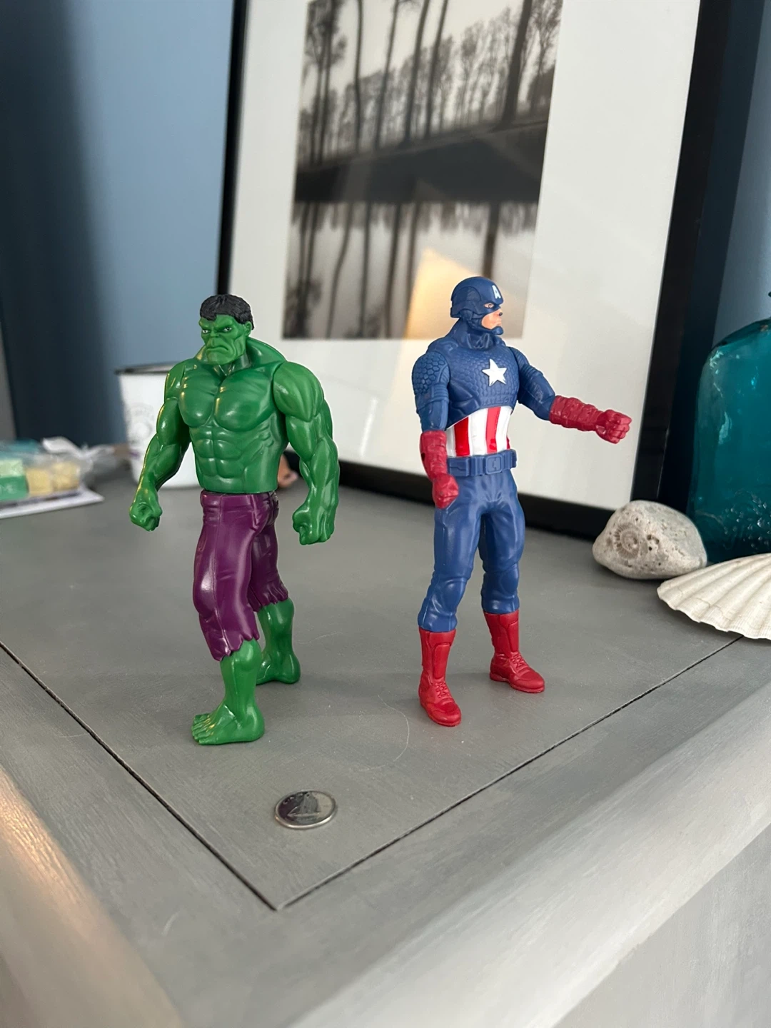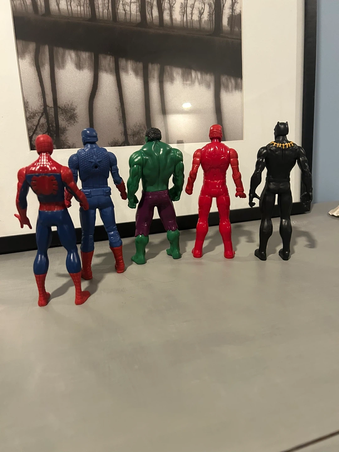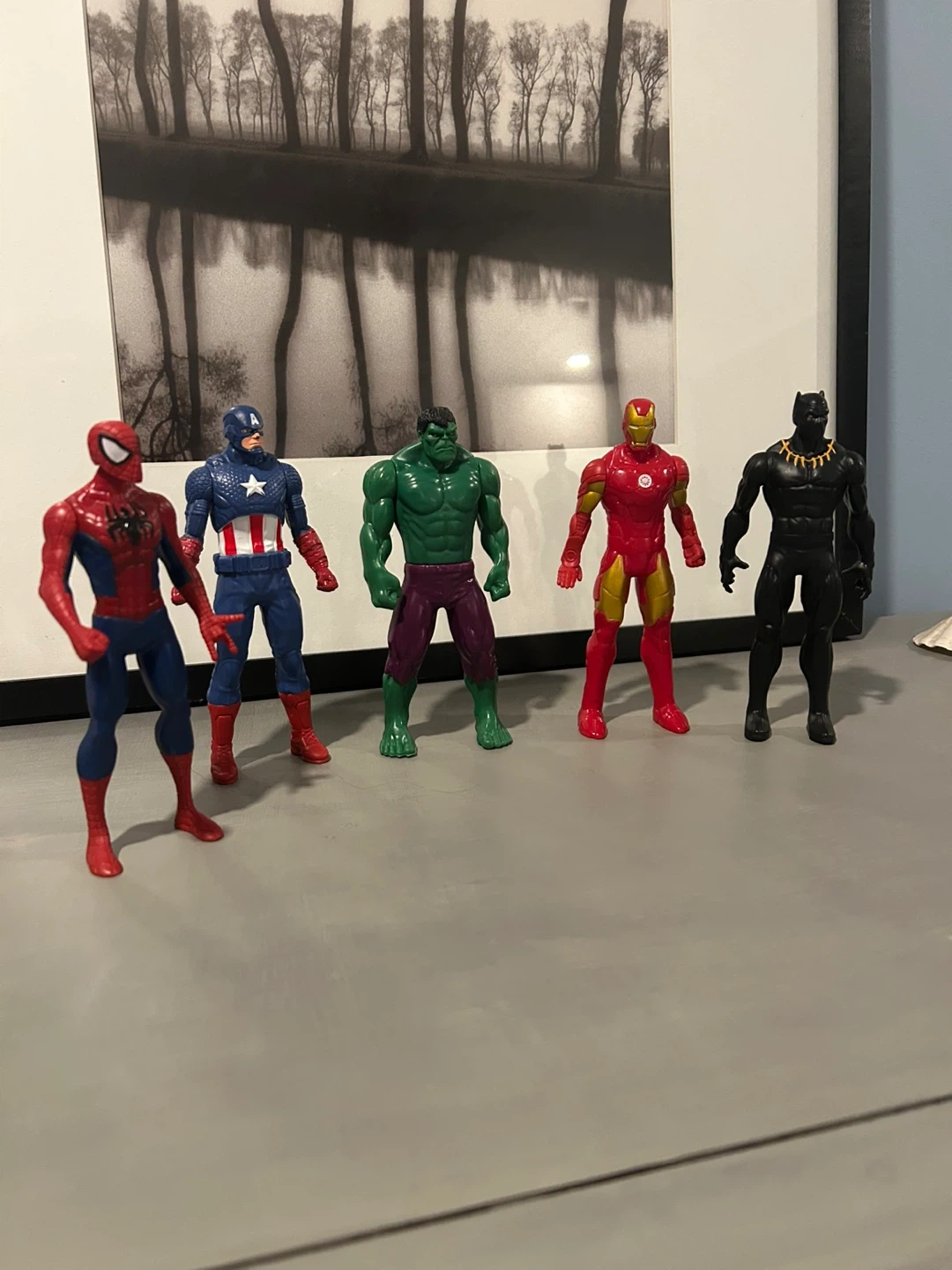 This set includes five action figures: Spider-Man, Captain America, Hulk, Iron Man, and Black Panther. They're made of plastic and are great for play or display. These figures are ideal for any Marvel fan!