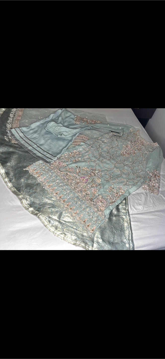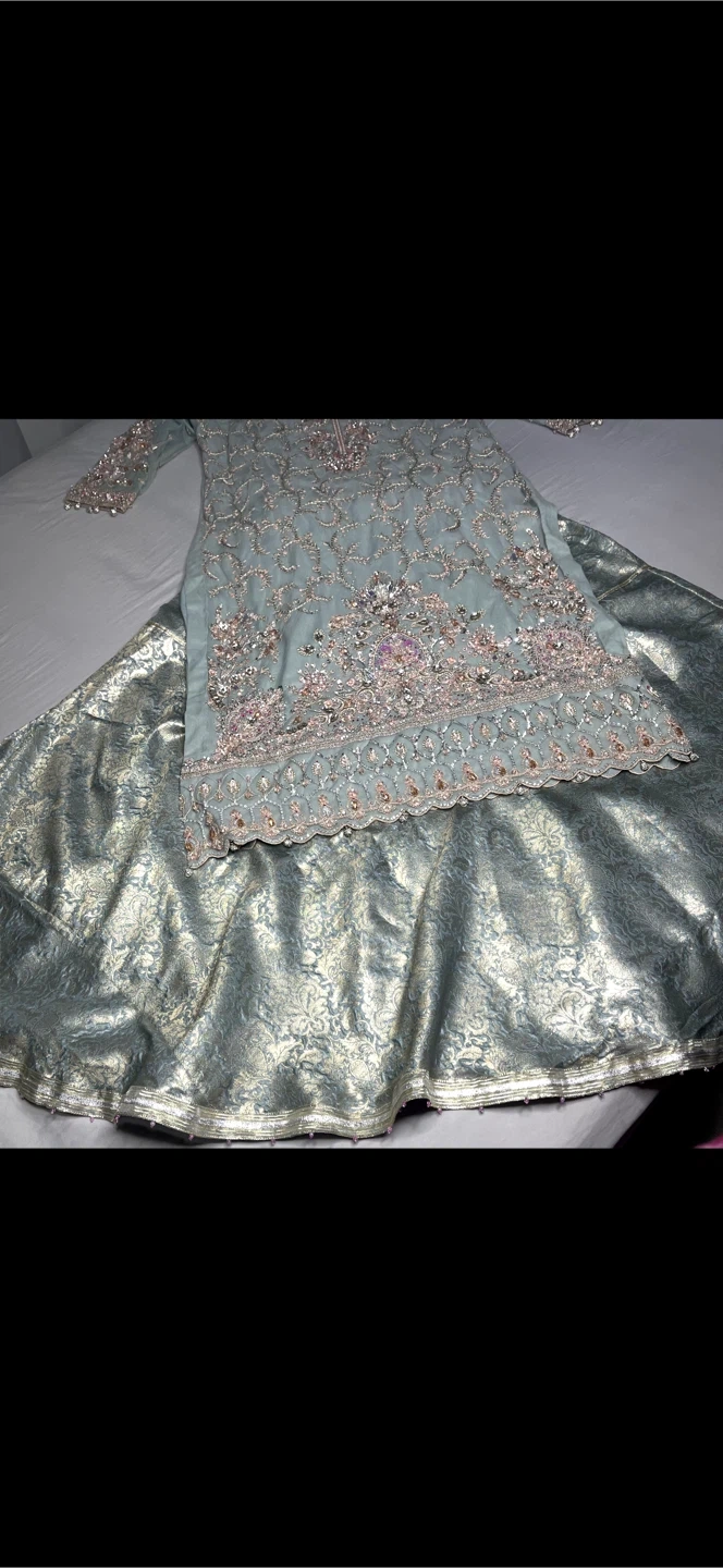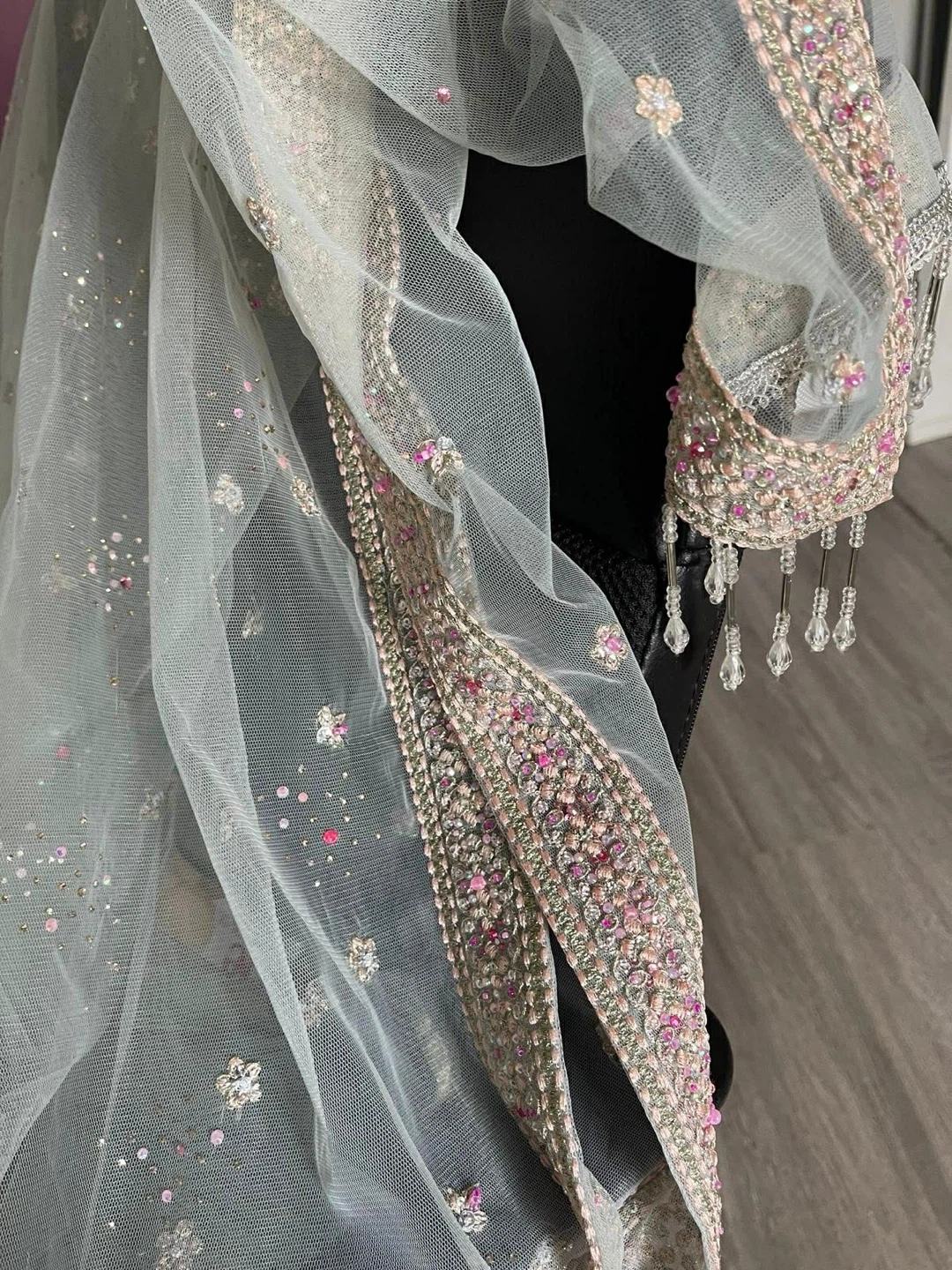 Beautifully embellished and heavy work with crystals, stones, beads, rhinestones, tilla and resham.