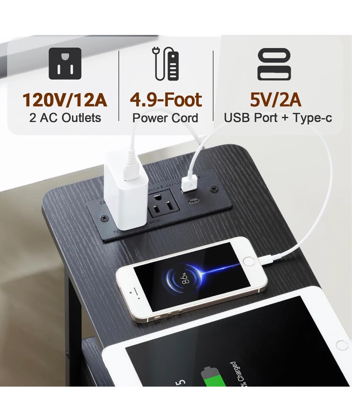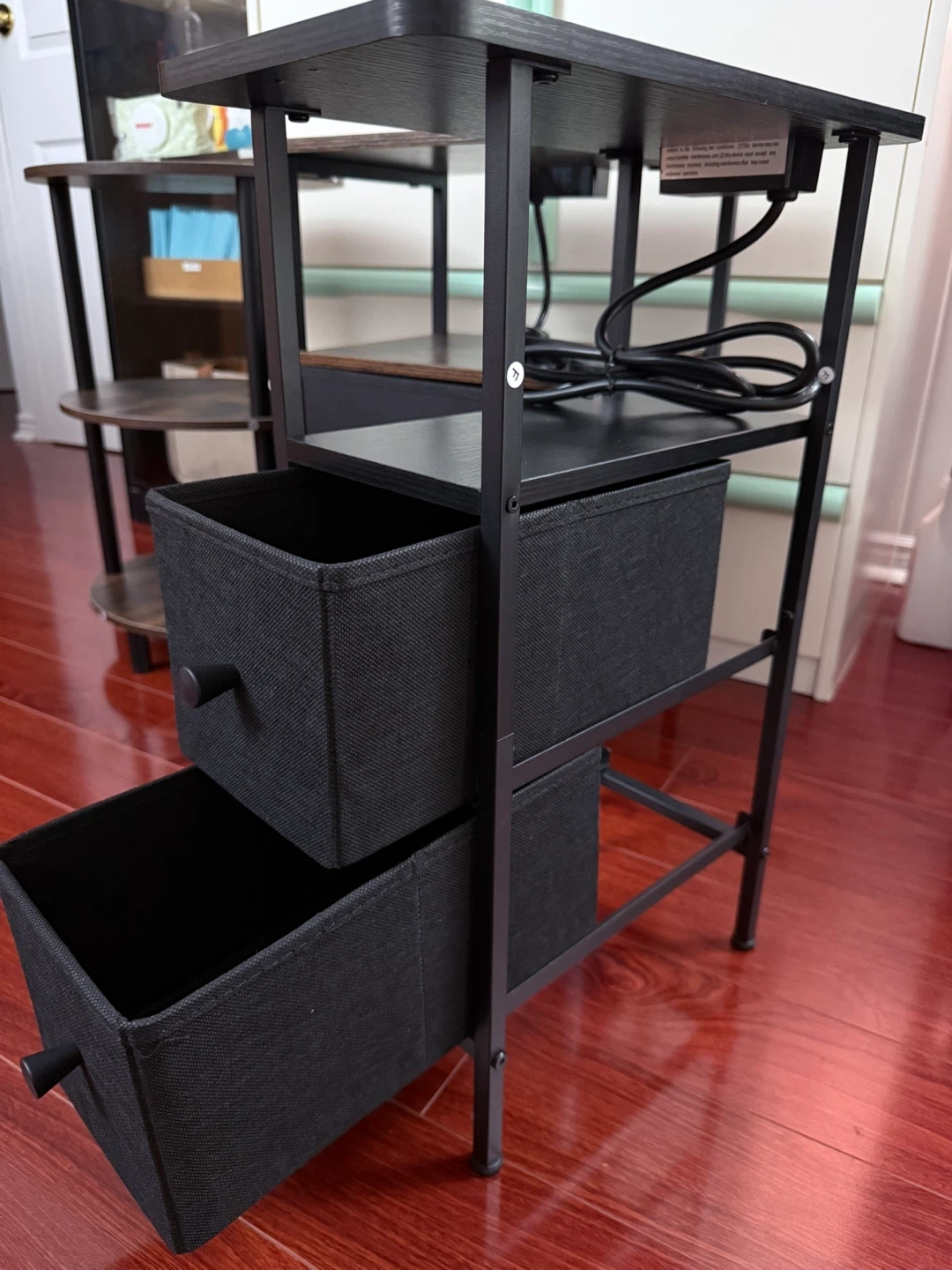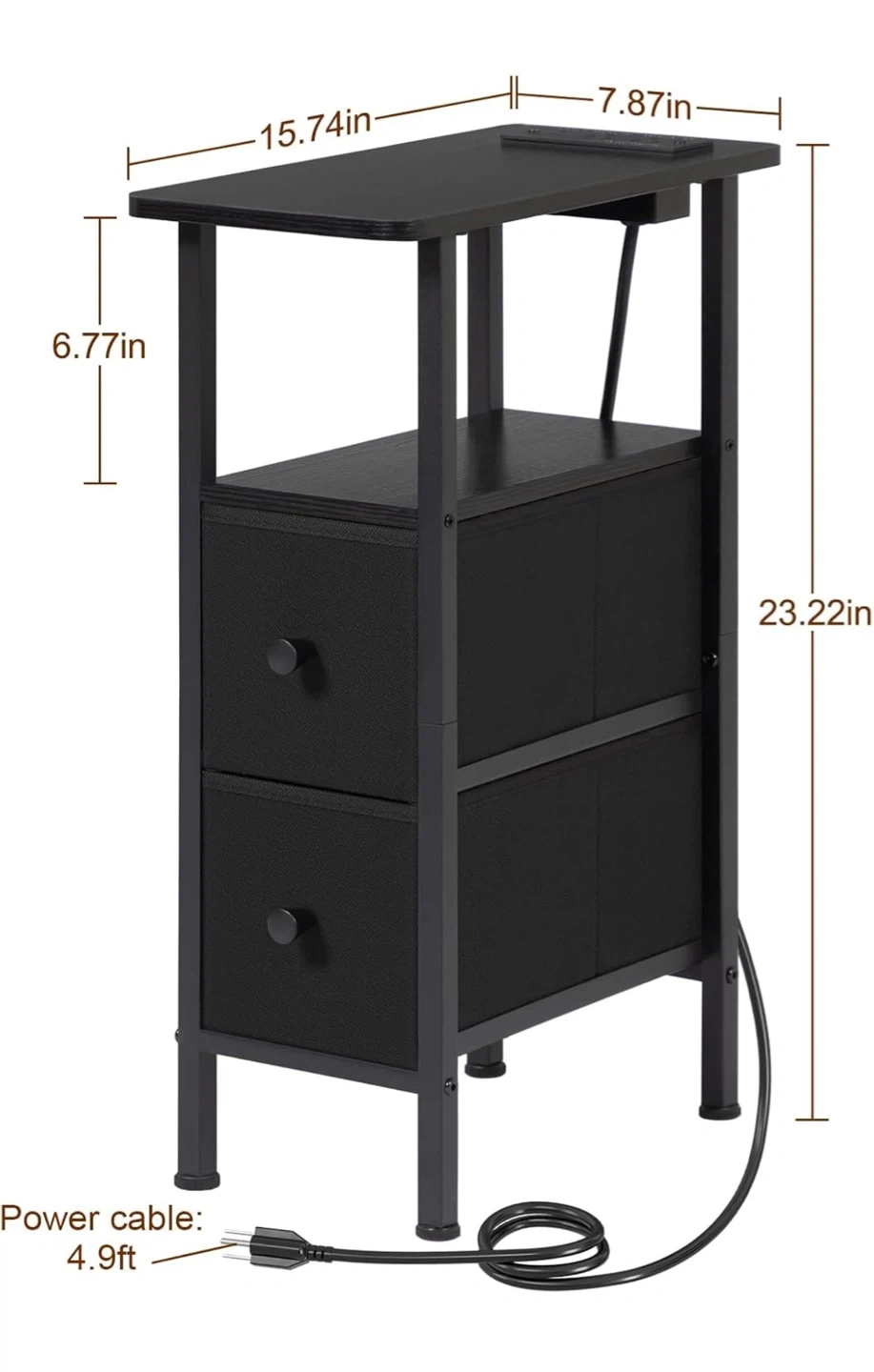 This narrow side table features two fabric drawers for storage. It includes 2 AC outlets and a USB port with a 4.9-foot power cord, making it convenient for charging devices. The table's compact design is ideal for small spaces.