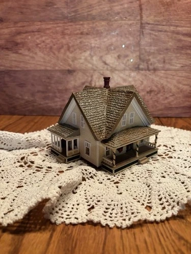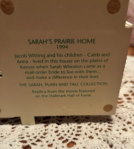 Capture the charm of a bygone era with the 1994 Hallmark Sarah's Prairie Home from the beloved Sarah's Plain and Tall collection. This nostalgic piece features a square design, mimicking the quaint architecture of the country. The beige and white house is crafted from plastic, highlighting the intricate details and vibrant hues that bring this village scene to life. The front porch is decorated for Christmas including a wreath on the front wall Designed to fit seamlessly into any room or existing collection, this original model reflects the quality and style of Hallmark's craftsmanship. It comes boxed, ready to be displayed or gifted, making it an ideal choice for collectors and enthusiasts of holiday and seasonal decor. Embrace the warmth and simplicity of Sarah's Prairie Home, a treasured piece from the 1990s.