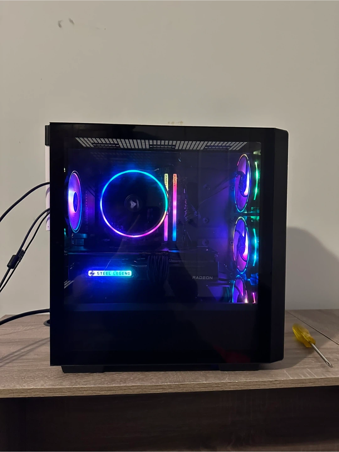 RX 9070 XT | Ryzen 7 7700 Gaming PC, it runs with no issues whatsoever perfect for 1440p/4K without any bottleneck. Can be tested before purchase and delivered. Full Specification List: GPU: Steel Legend RX 9070 XT 16GB (5070 Ti Equivalent) CPU: Ryzen 7 7700 Storage: 2TB Crucial Gen4 NVMe SSD RAM: T-Force Vulcan RGB (2x16, 6000MHz) MOBO: ASUS TUF Gaming A620M Plus WiFi PSU: Corsair RM750, 80+ Gold, Fully Modular (All cables included in box) Case: Armoury Case WiFi + Bluetooth Price is firm DM if you have any questions!