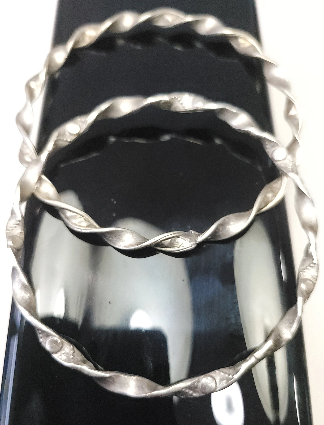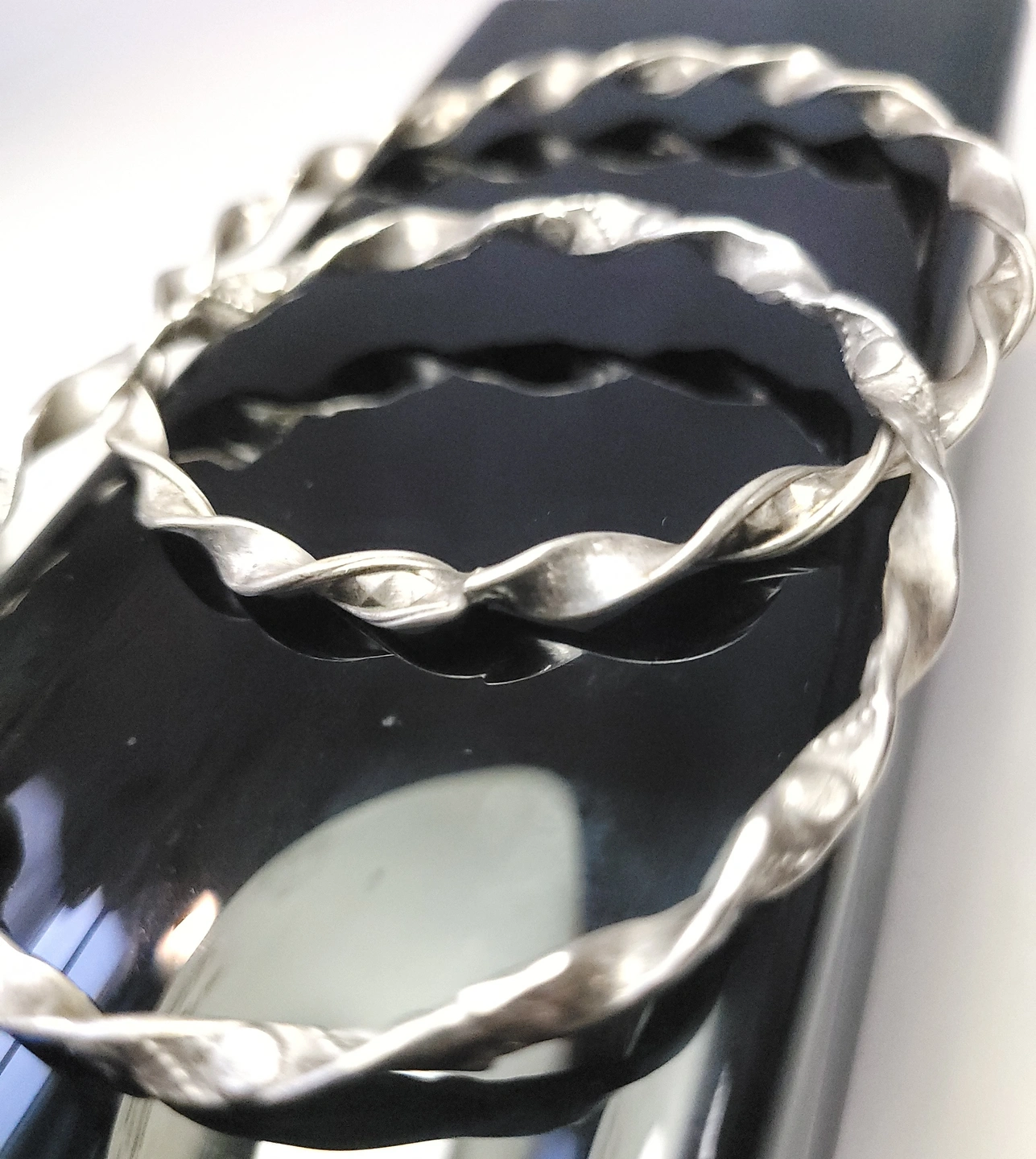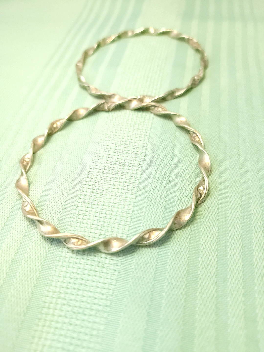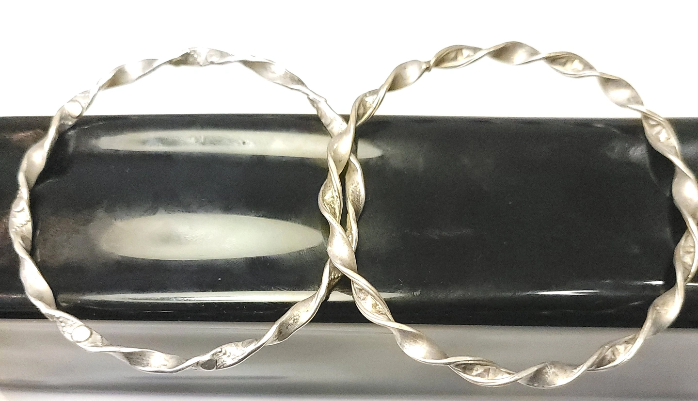 Set of two silver-tone bangles with a twisted ribbon design. These are solid, non-adjustable bracelets with a 7.5cm diameter, suitable for a medium to large wrist. The 4mm width makes them ideal for stacking.