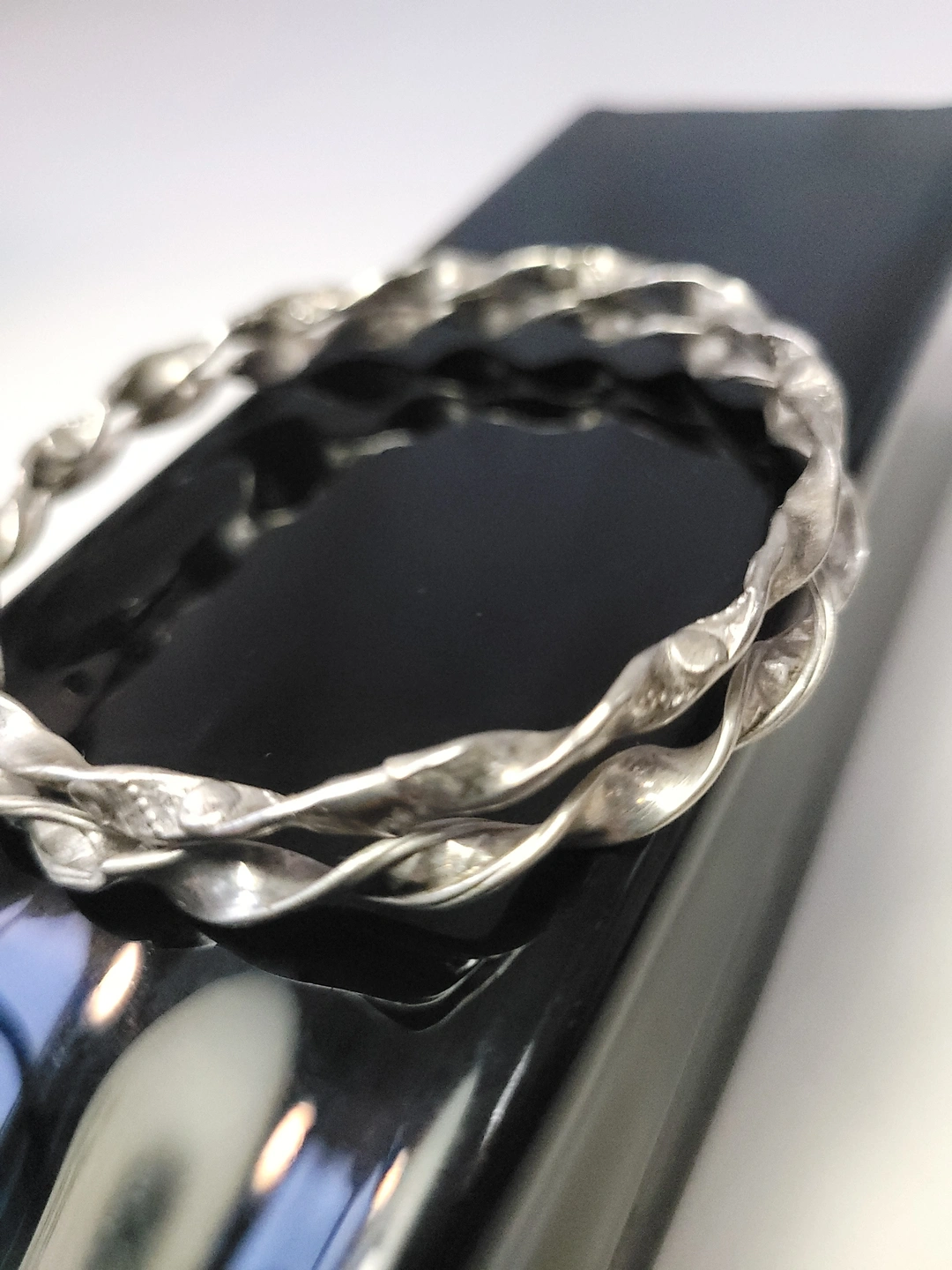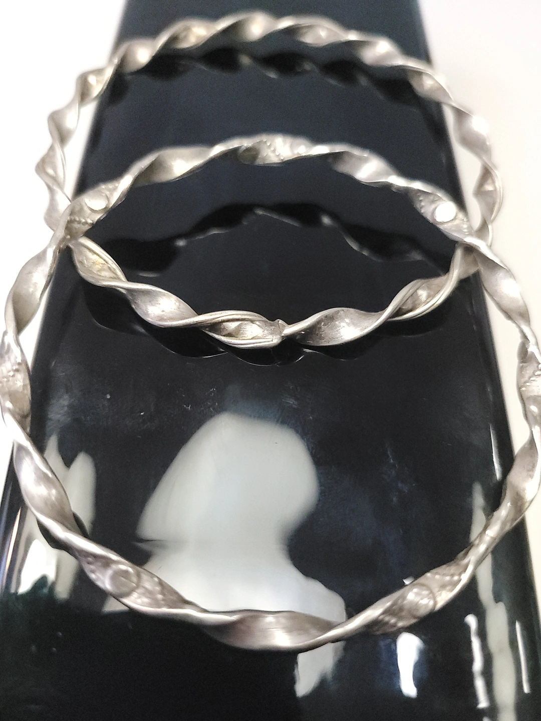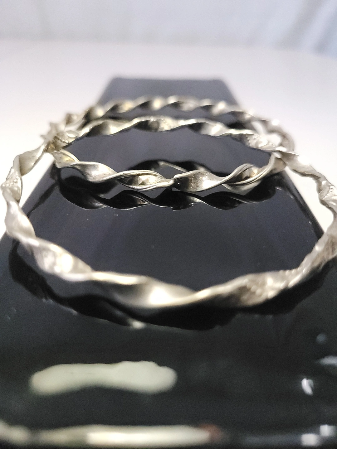 Set of two silver-tone bangles with a twisted ribbon design. These are solid, non-adjustable bracelets with a 7.5cm diameter, suitable for a medium to large wrist. The 4mm width makes them ideal for stacking.