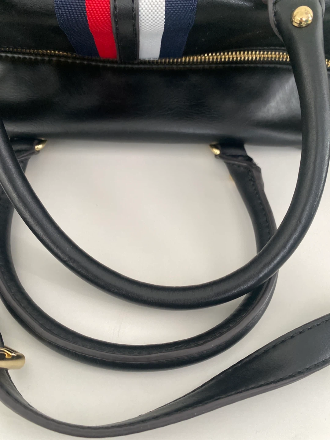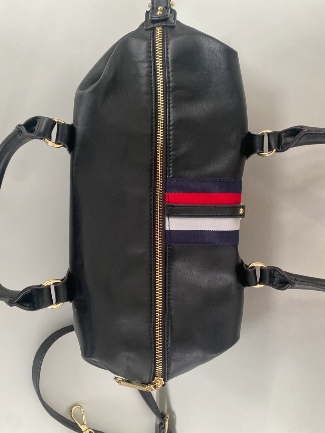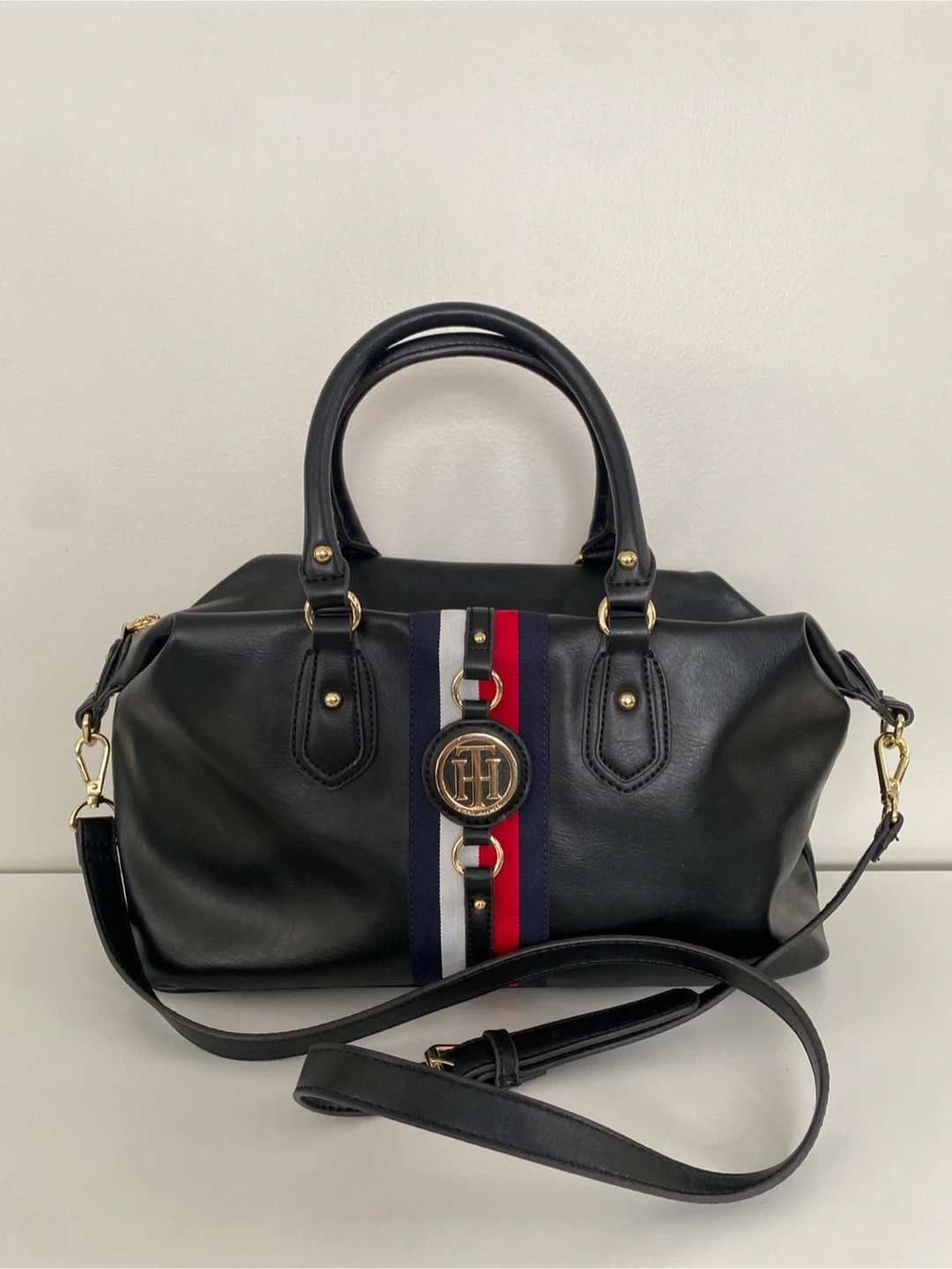 This is a black Tommy Hilfiger Bag . It features gold hardware and the brand's signature stripe detail. Includes both top handles and a detachable shoulder strap.