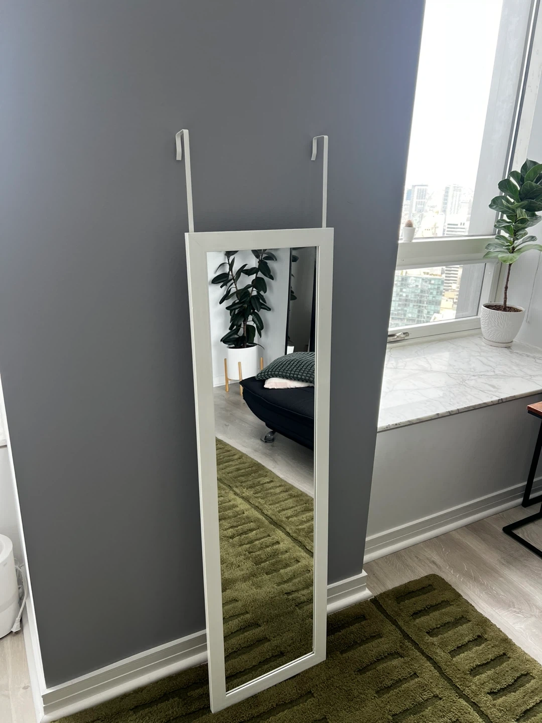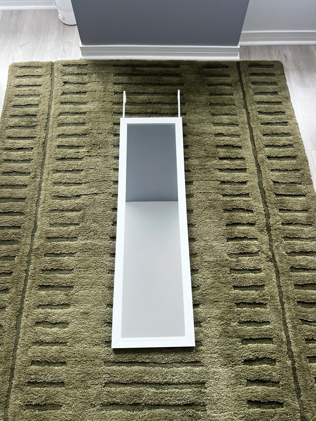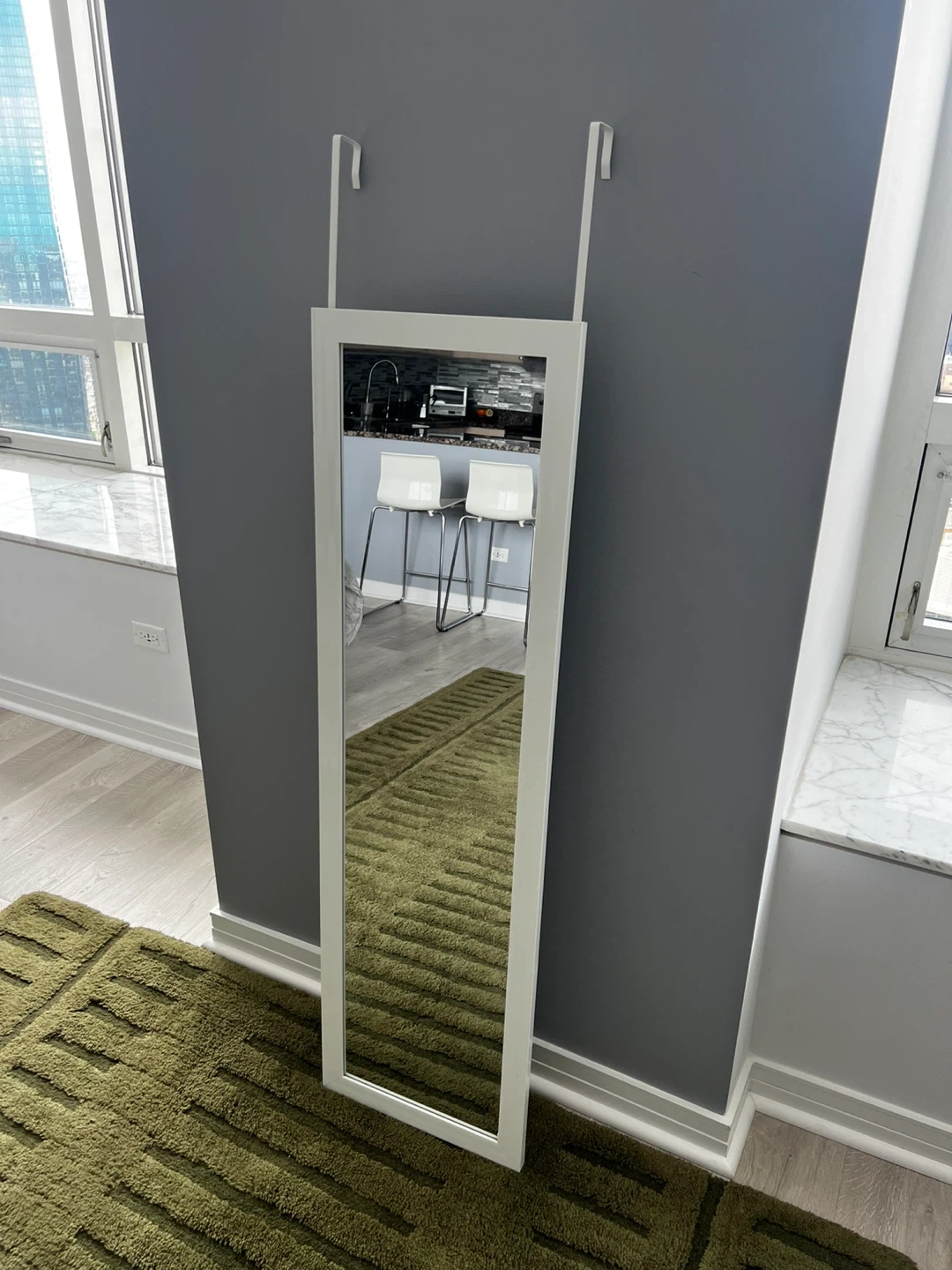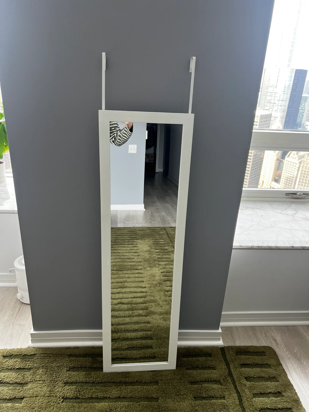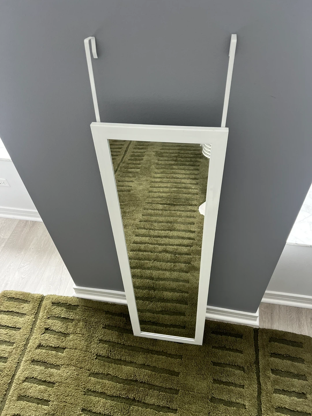 This is a full-length mirror with a white frame, designed to hang over a door. It's perfect for checking your outfit before you leave. Mirror measures with the reflective surface being 15” x 51”