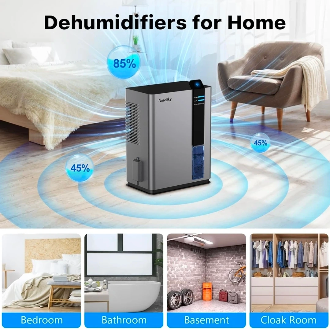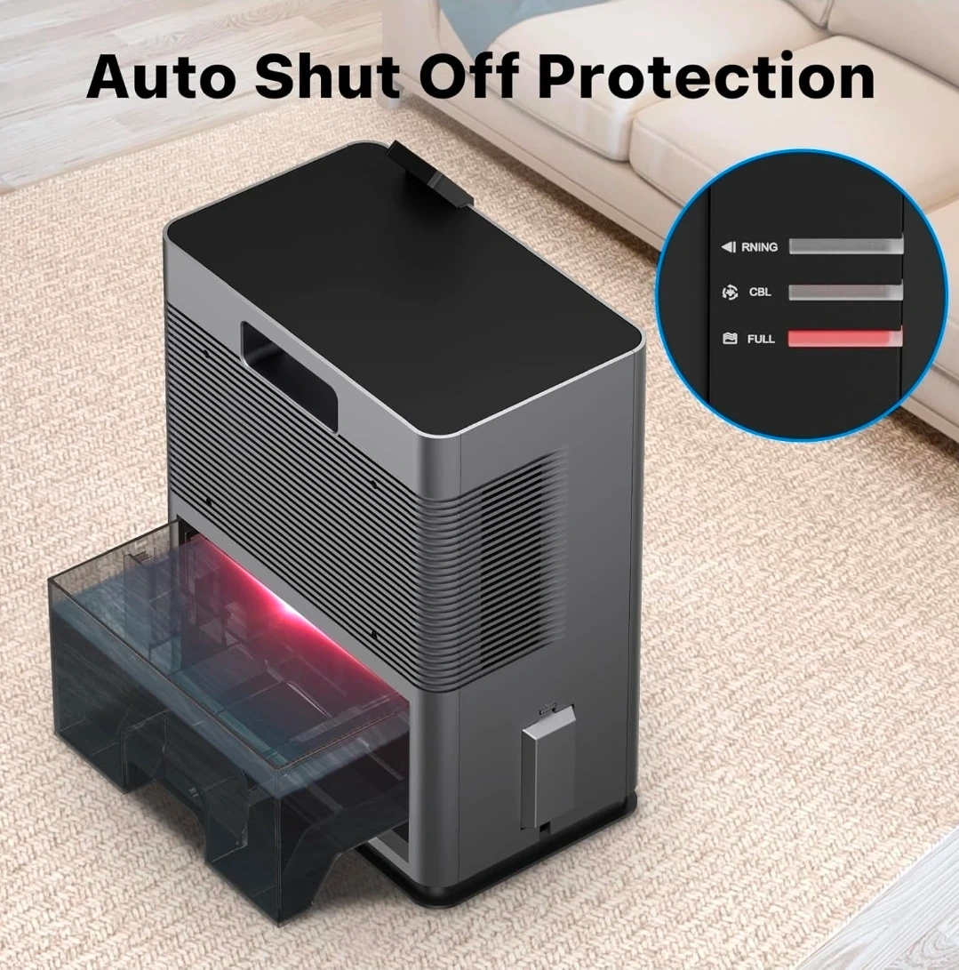 NineSky portable dehumidifier with a 98oz capacity. It absorbs up to 34 oz/day and features auto shut-off protection. This unit has a portable handle and organized design for easy placement. It can also change light colours! Dual semiconductors for high-efficiency dehumidification.