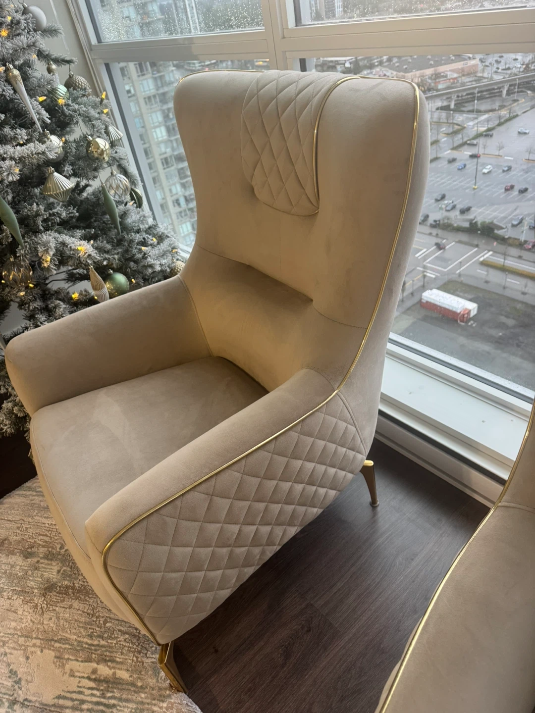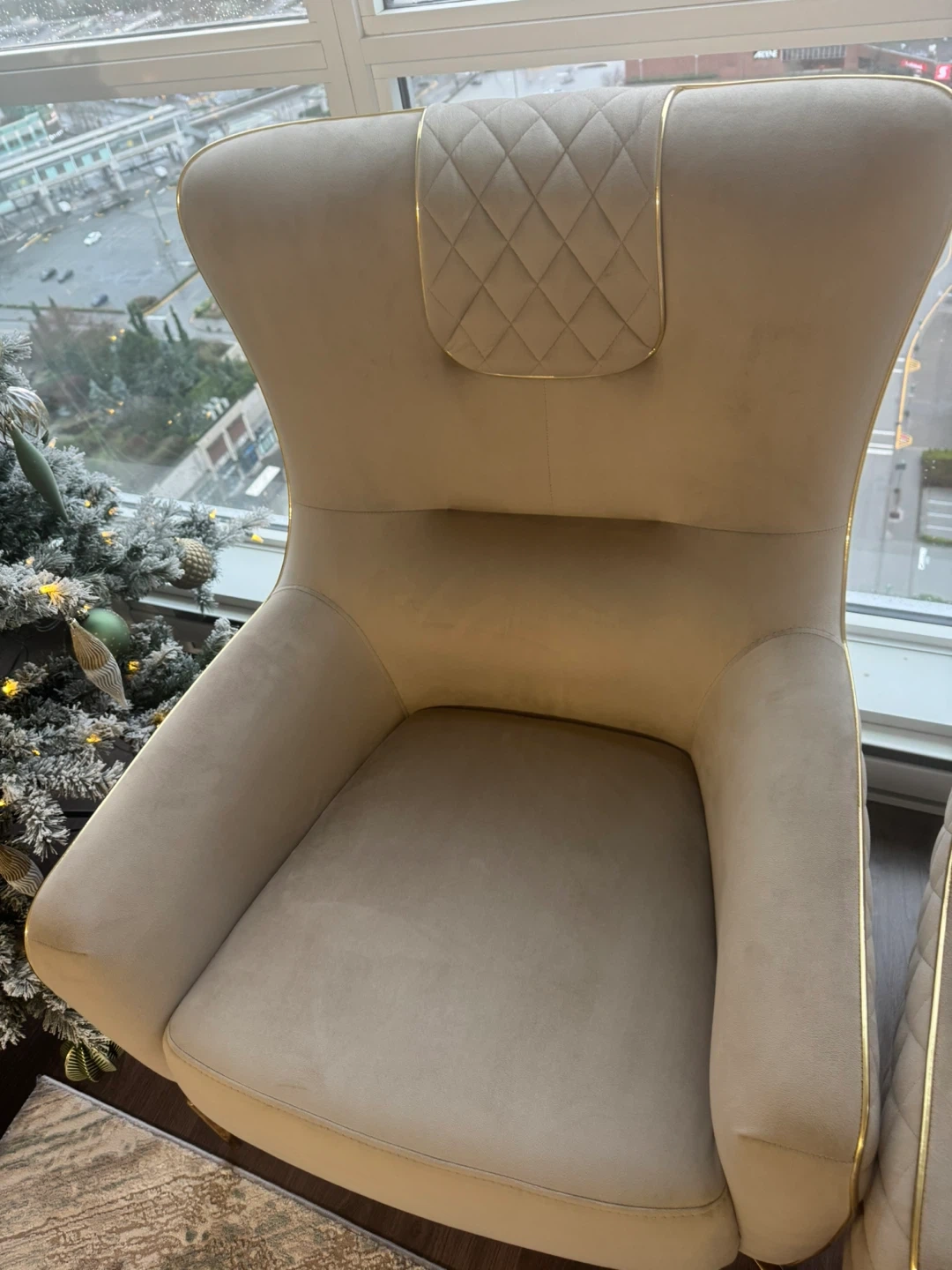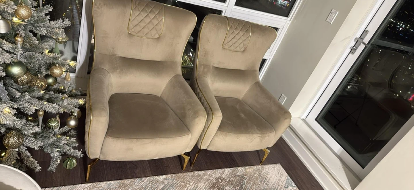 Selling a set of two high-quality beige accent chairs.