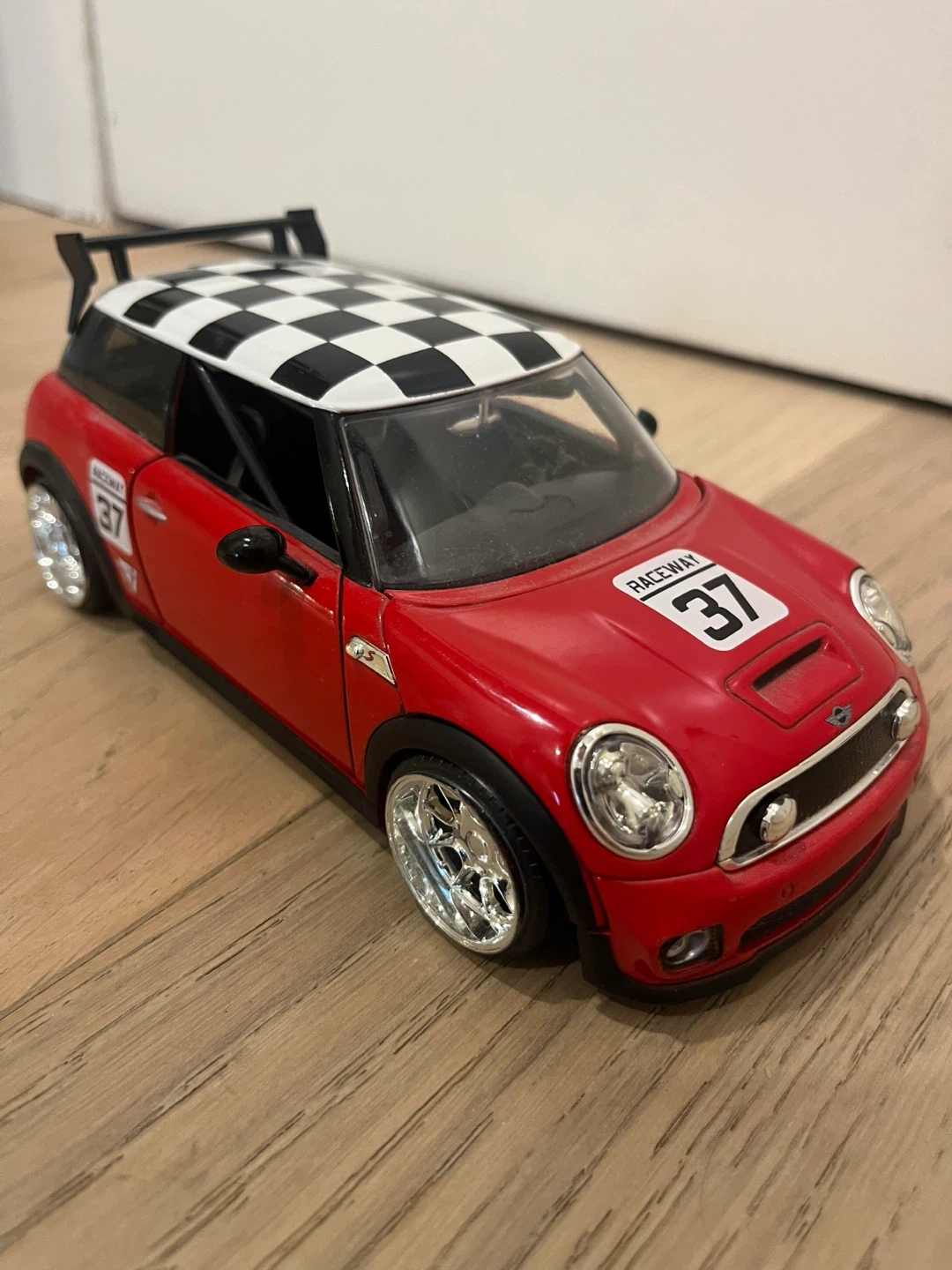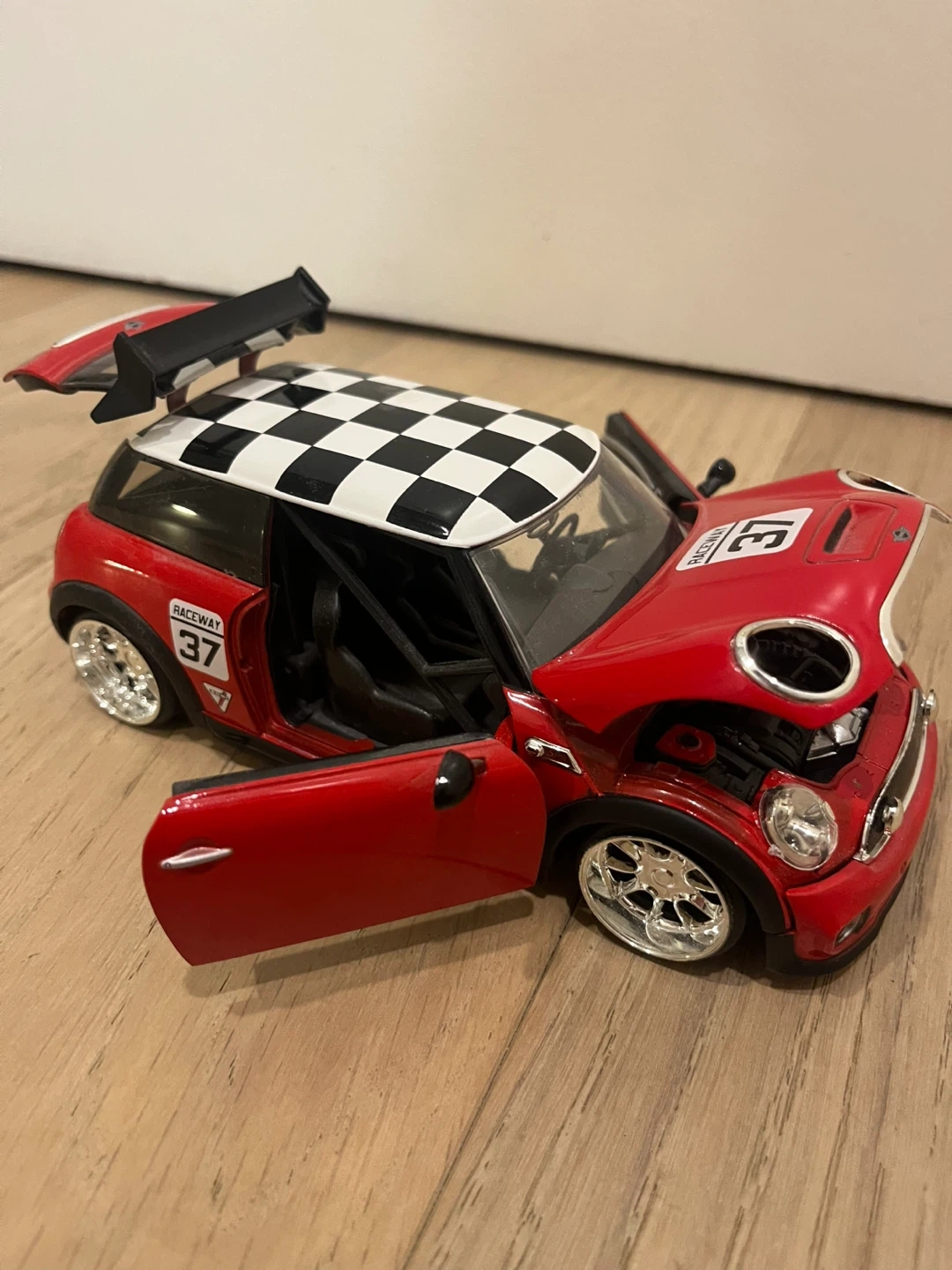 This is a red diecast model of a Mini Cooper, styled for racing with a checkered roof and "37" decals. The doors and hood open to reveal interior details. It's a detailed replica for collectors or playtime.