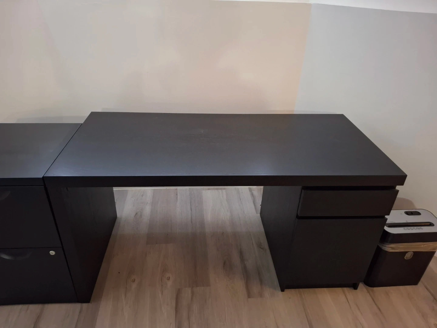 This is a dark brown desk. It features one drawer and small cabinet on the right side for storage. The desk has a sturdy build and a clean, modern design. It's a functional piece for any home office or study area.