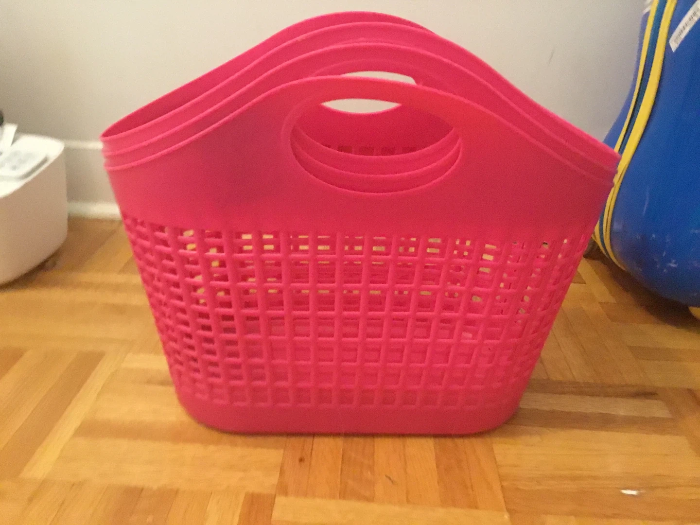 Set of three identical pink woven-style plastic storage baskets. Each basket has two easy-carry handles. Perfect for organizing small items in any room!