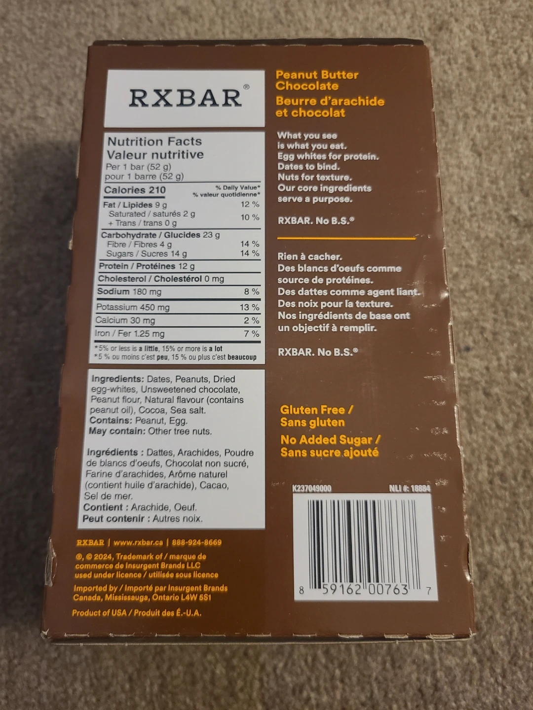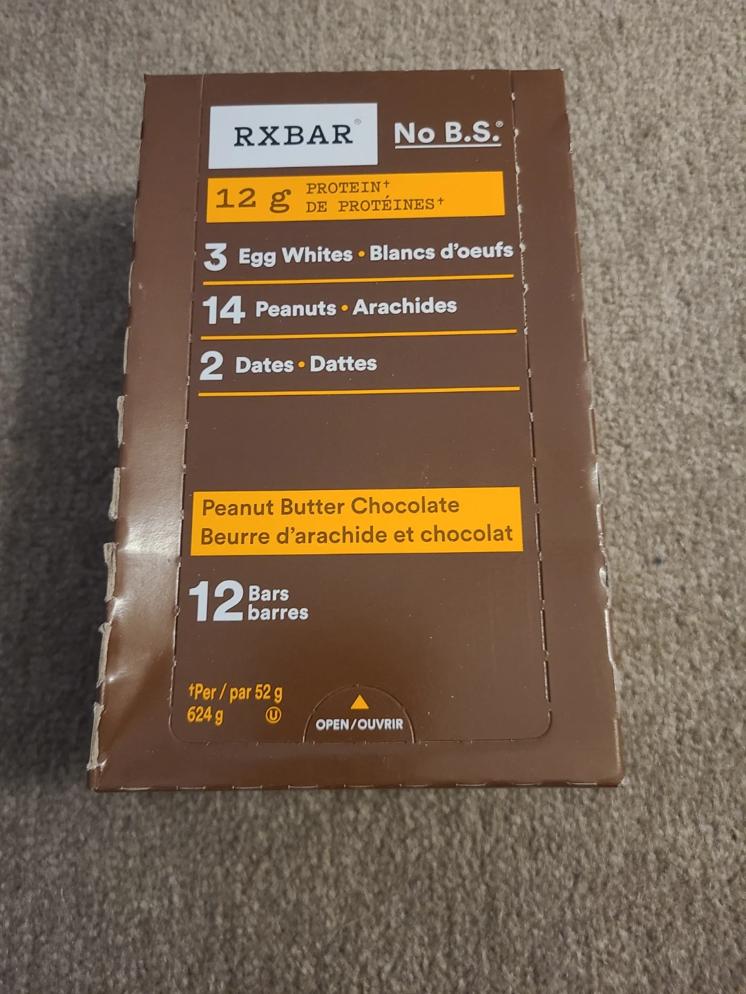 140Selling 4 boxes of RXBAR Peanut Butter Chocolate protein bars. Each box contains 12 bars, and each bar has 12g of protein. They're made with egg whites, dates, and nuts. The best before date is 2026 July 01