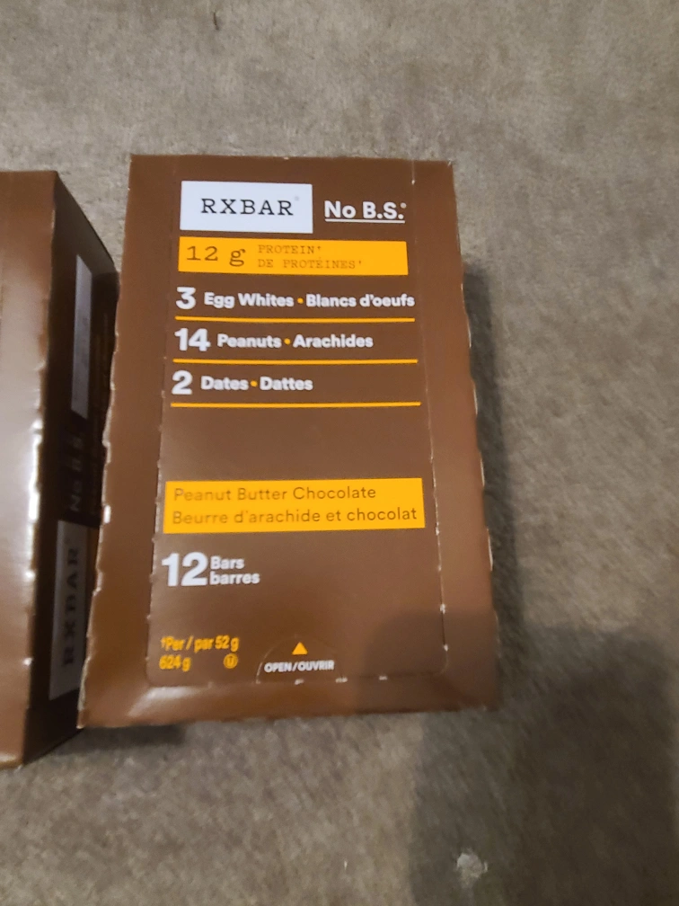Selling a box of RXBAR Peanut Butter Chocolate protein bars. Each box contains 12 bars. These bars have 12g of protein, 3 egg whites, 14 peanuts, and 2 dates. Best before 2026 July 01