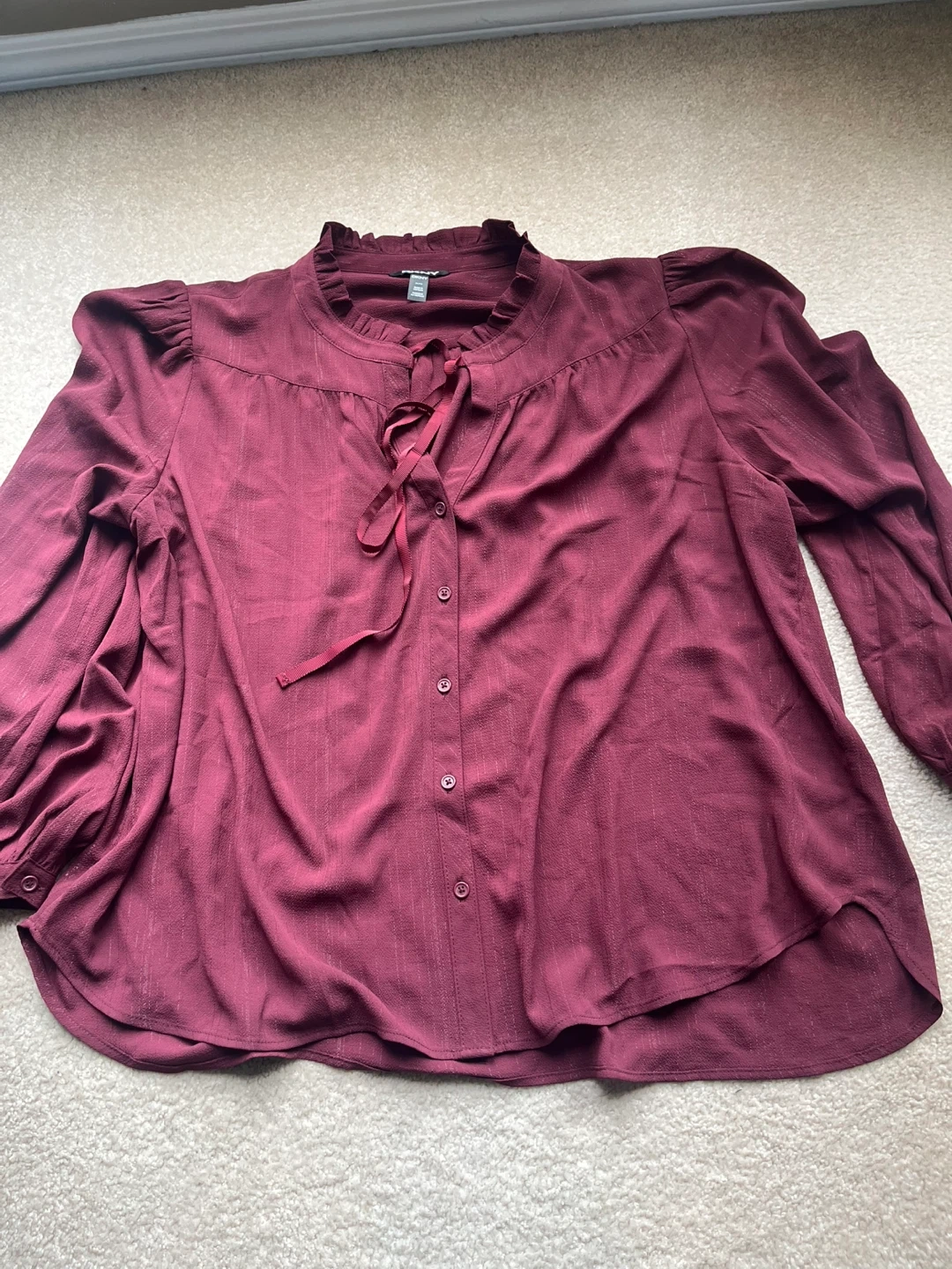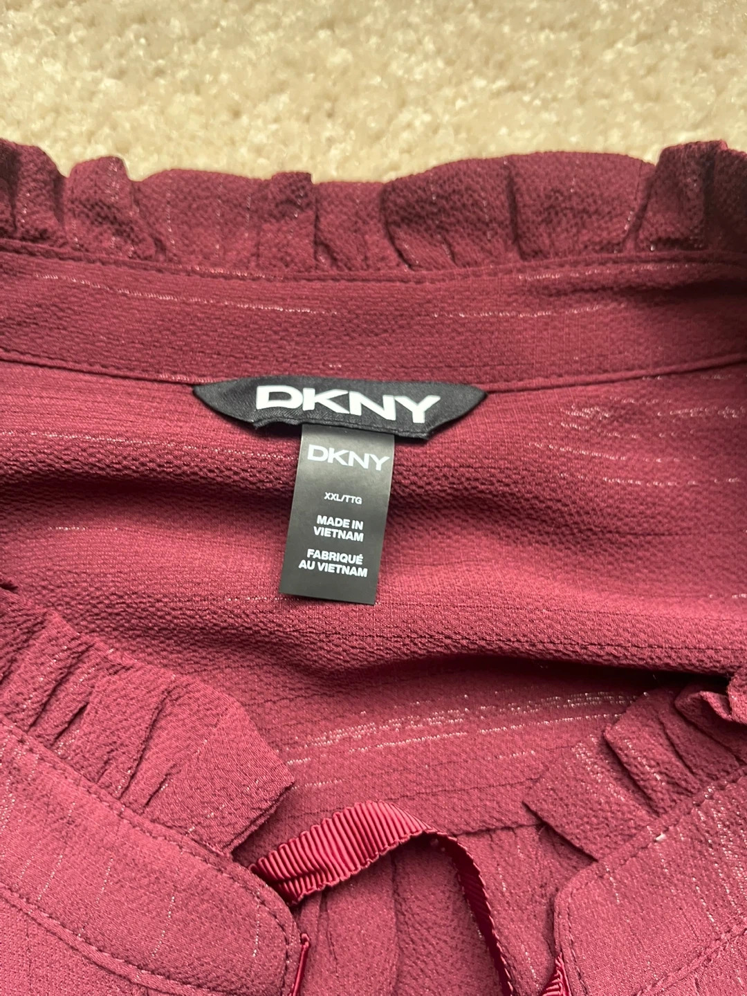 DKNY burgundy blouse with a ruffled neckline and tie detail. It's a size XX-Large. Long sleeves with elastic cuffs. Never worn